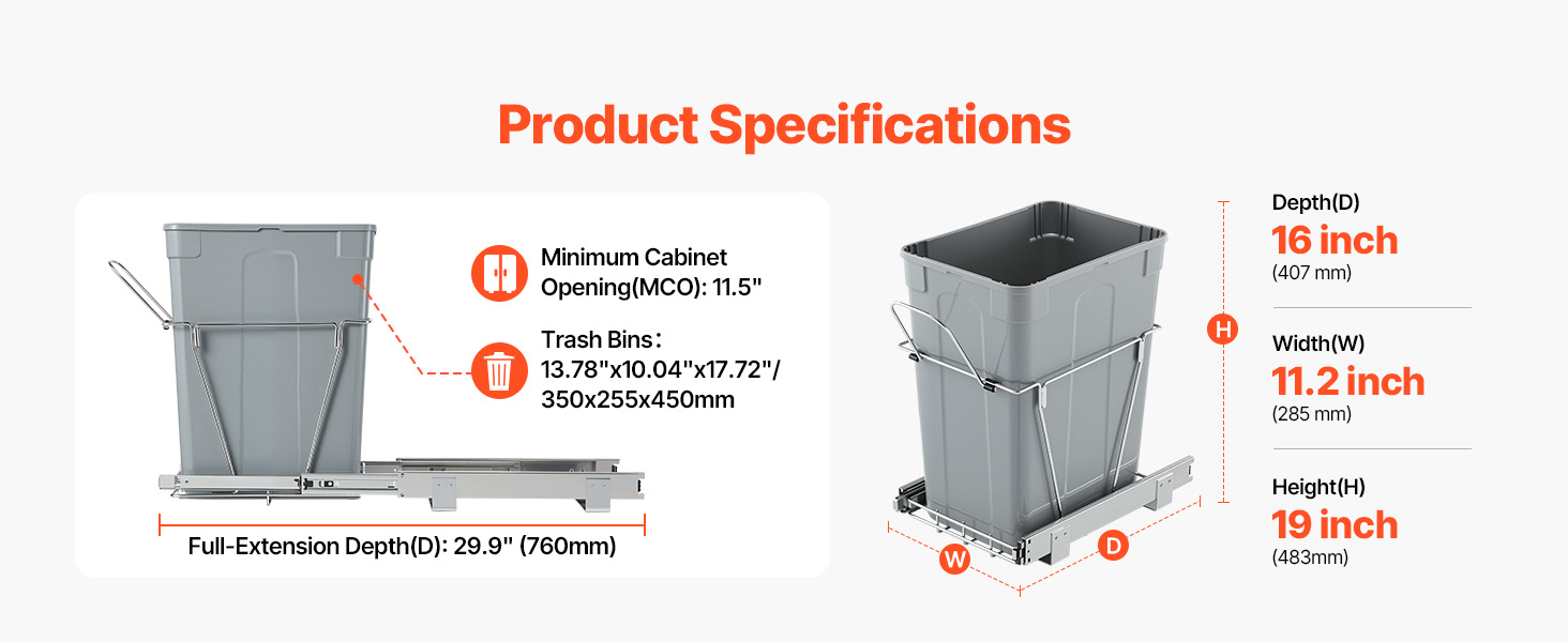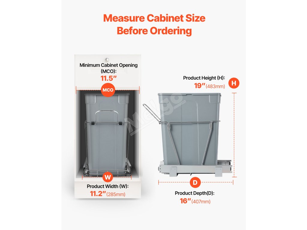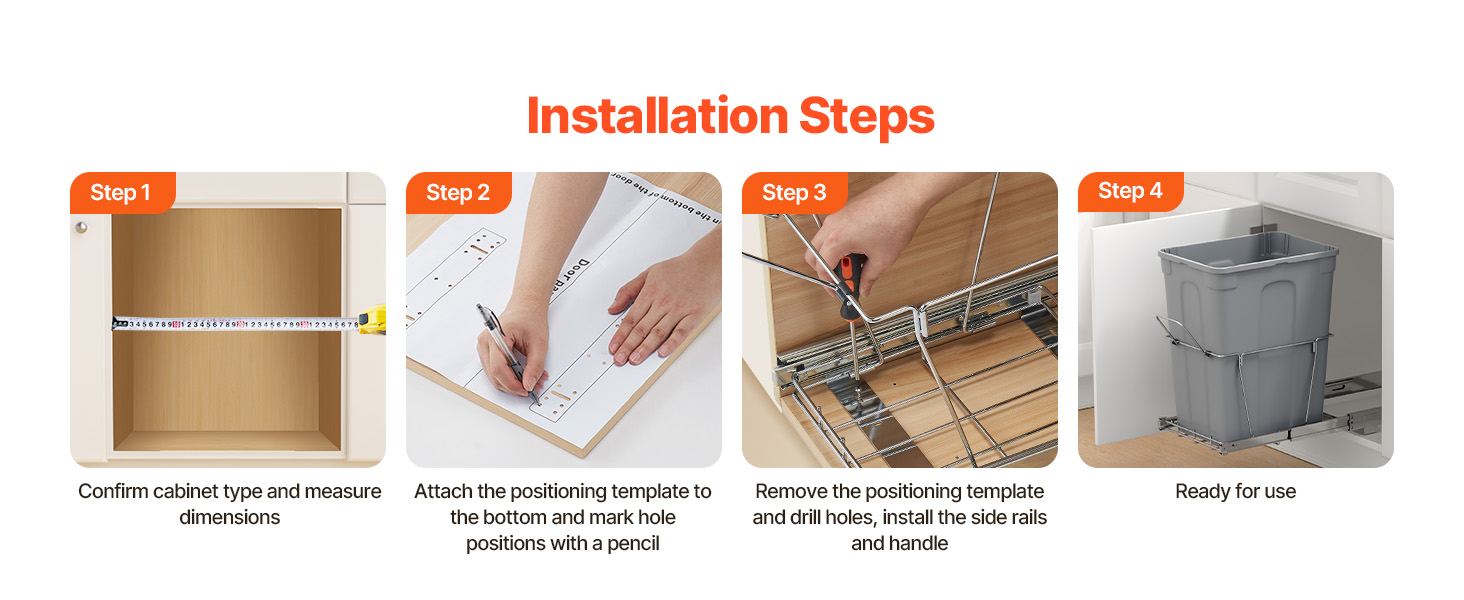 Vysúvací odpadkový kôš sa dá ľahko nainštalovať za pár minút. Pomocou priložených montážnych otvorov a skrutiek ho môžete rýchlo namontovať na vašu skrinku. Konštrukcia rukoväte vám uľahčuje otváranie kuchynskej skrinky a vysúvanie odpadkového koša, čo je čisté a hygienické.