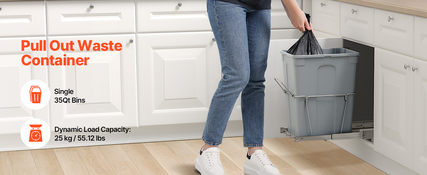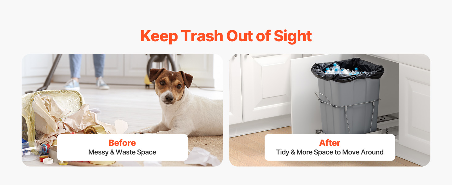 Kedykoľvek potrebujete vyhodiť odpadky, jednoducho vytiahnite koš zo spodnej skrinky. Tým ušetríte priestor na podlahe a vaša kuchyňa bude čistejšia a prehľadnejšia. Účinne zabraňuje náhodnému prevráteniu deťmi alebo domácimi zvieratami, čím sa zachová čistota.