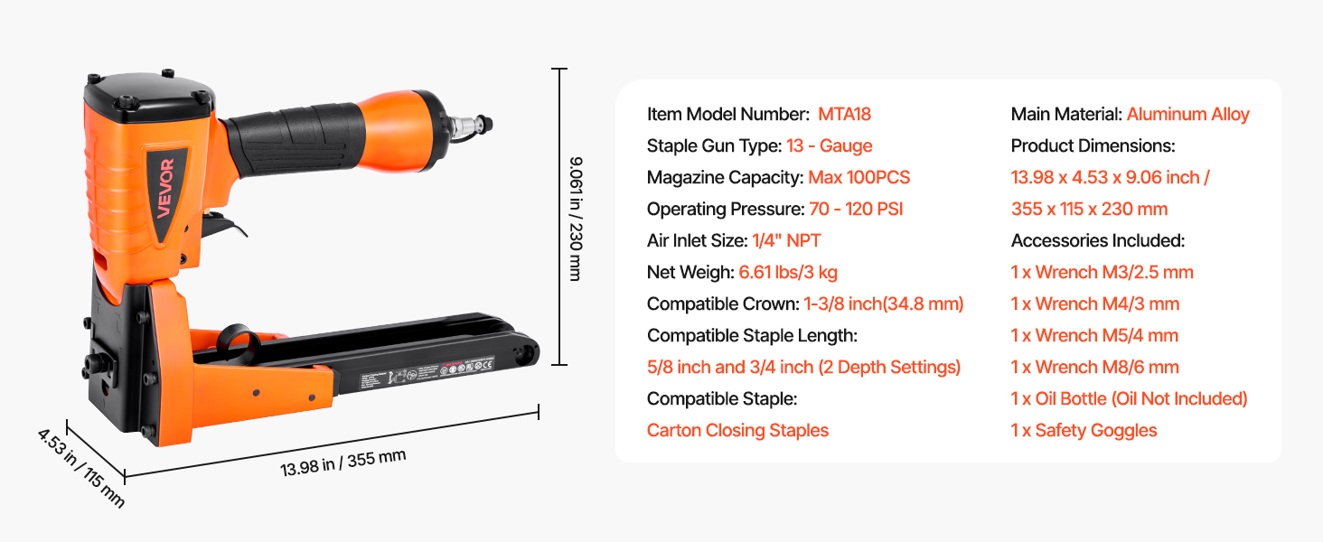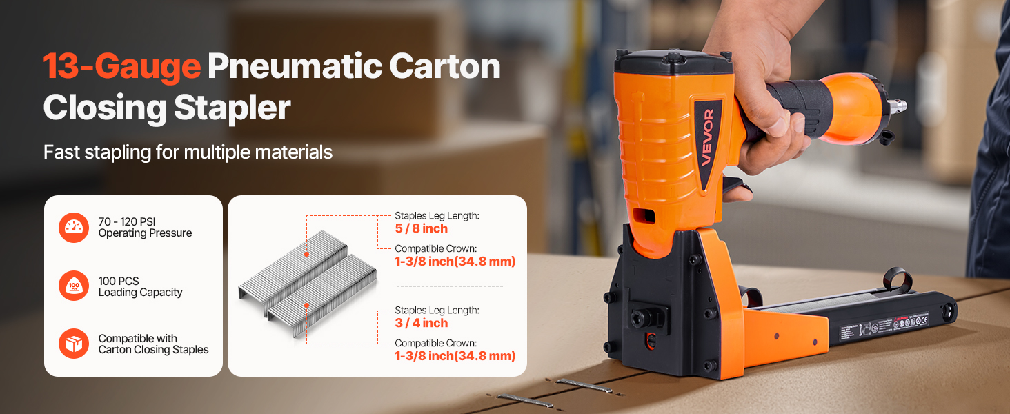 Táto 13-palcová pneumatická sponkovačka je kompatibilná so sponkami na uzatváranie kartónov s korunkou 1-3/8" (34,8 mm) a dĺžkami nožičiek 5/8" a 3/4" (16 mm a 19 mm). Obsahuje 2-úrovňové nastavenie hĺbky a veľkokapacitný zásobník, ktorý je ideálny na uzatváranie krabíc, zatváranie kartónov a balenie.