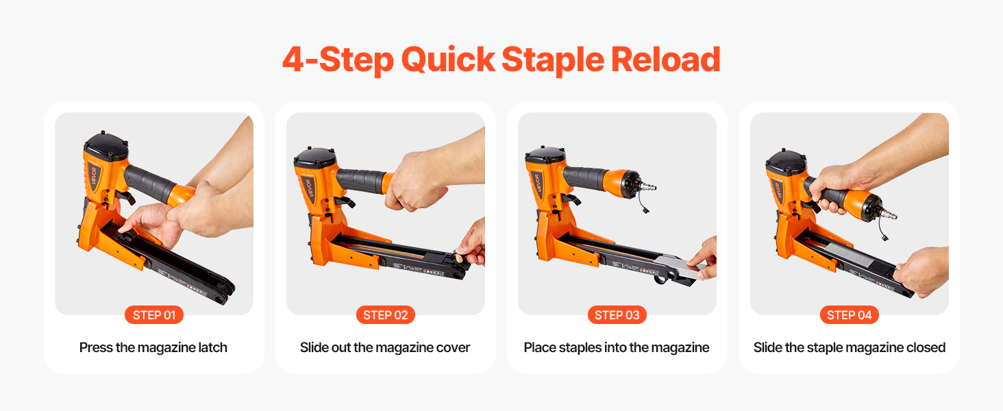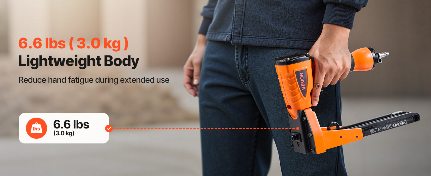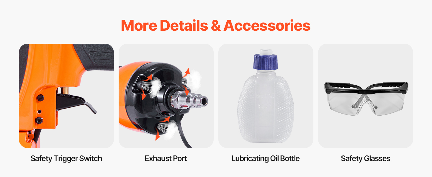 Naša pneumatická sponkovačka na kartón obsahuje bezpečnostný spínač spúšte, ktorý zabraňuje náhodnému výstrelu, konštrukciu so zadným výfukom a ochranné okuliare na ochranu očí počas prevádzky.