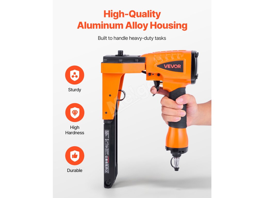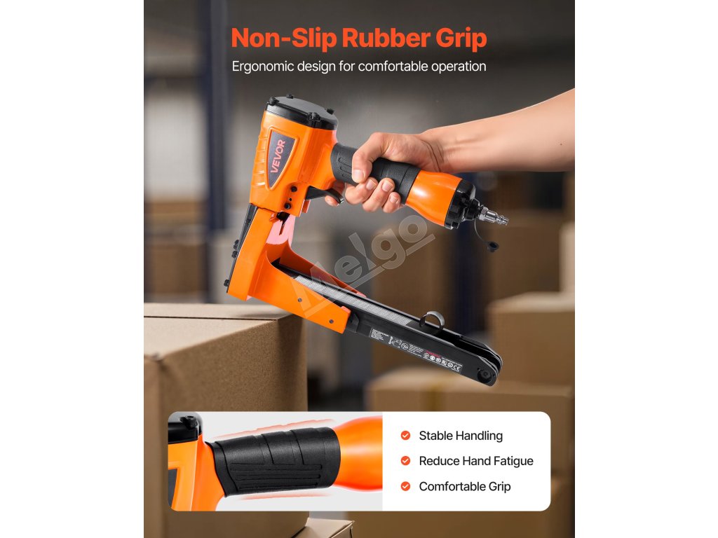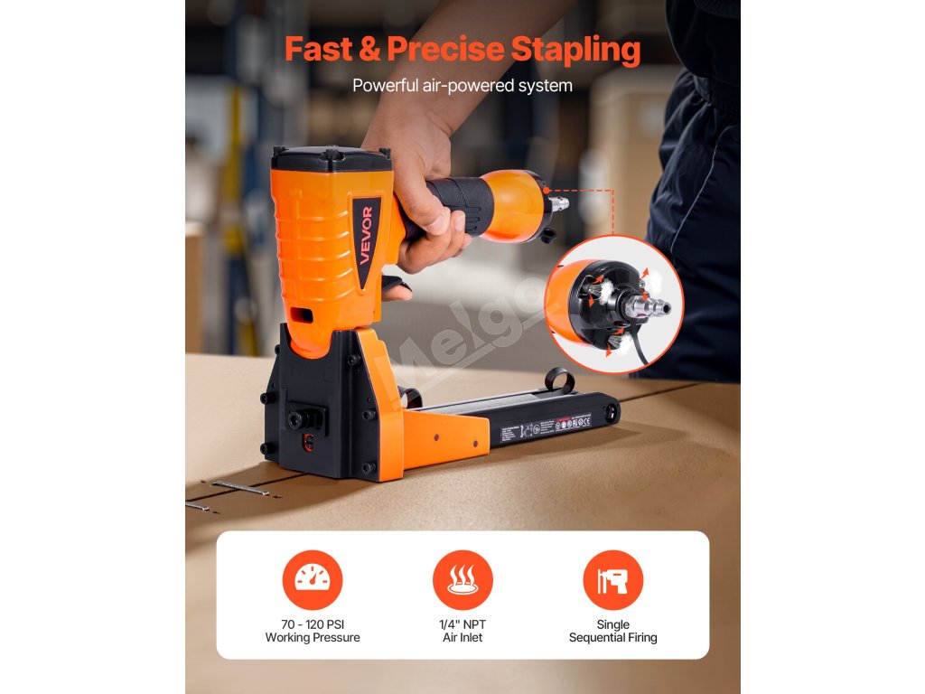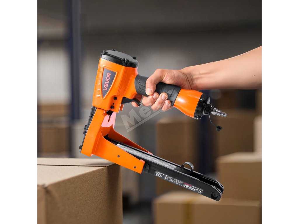 Naša pneumatická sponkovačka na kartón obsahuje bezpečnostný spínač spúšte, ktorý zabraňuje náhodnému výstrelu, konštrukciu so zadným výfukom a ochranné okuliare na ochranu očí počas prevádzky.