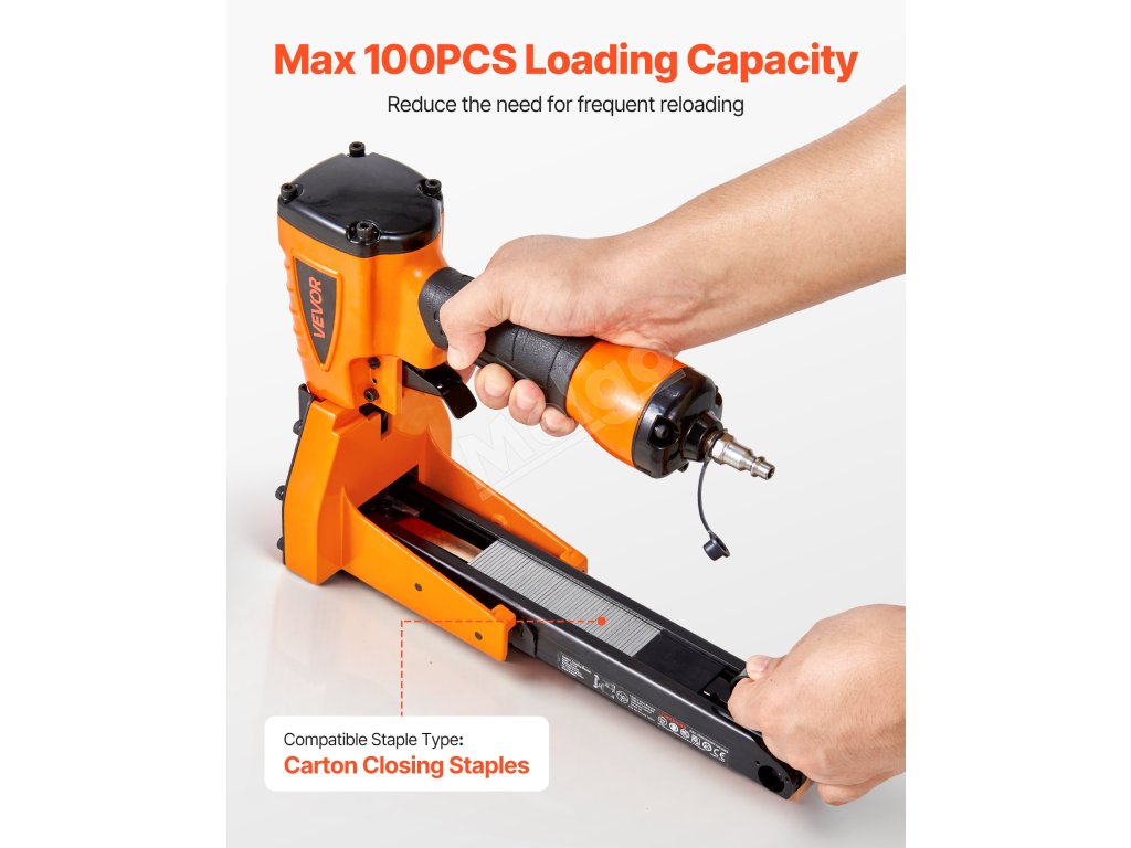 Táto vzduchová zošívačka na uzatváranie kartónov vybavená veľkokapacitným zásobníkom, ktorý pojme až 100 ks sponiek, minimalizuje potrebu častého dopĺňania a umožňuje efektívnejšiu prevádzku. (Sponky nie sú súčasťou balenia; zakúpte si ich prosím samostatne)