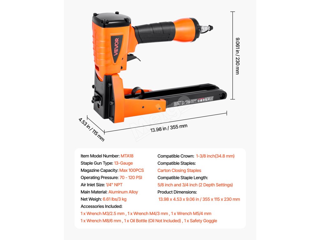 Táto 13-palcová pneumatická sponkovačka je kompatibilná so sponkami na uzatváranie kartónov s korunkou 1-3/8" (34,8 mm) a dĺžkami nožičiek 5/8" a 3/4" (16 mm a 19 mm). Obsahuje 2-úrovňové nastavenie hĺbky a veľkokapacitný zásobník, ktorý je ideálny na uzatváranie krabíc, zatváranie kartónov a balenie.