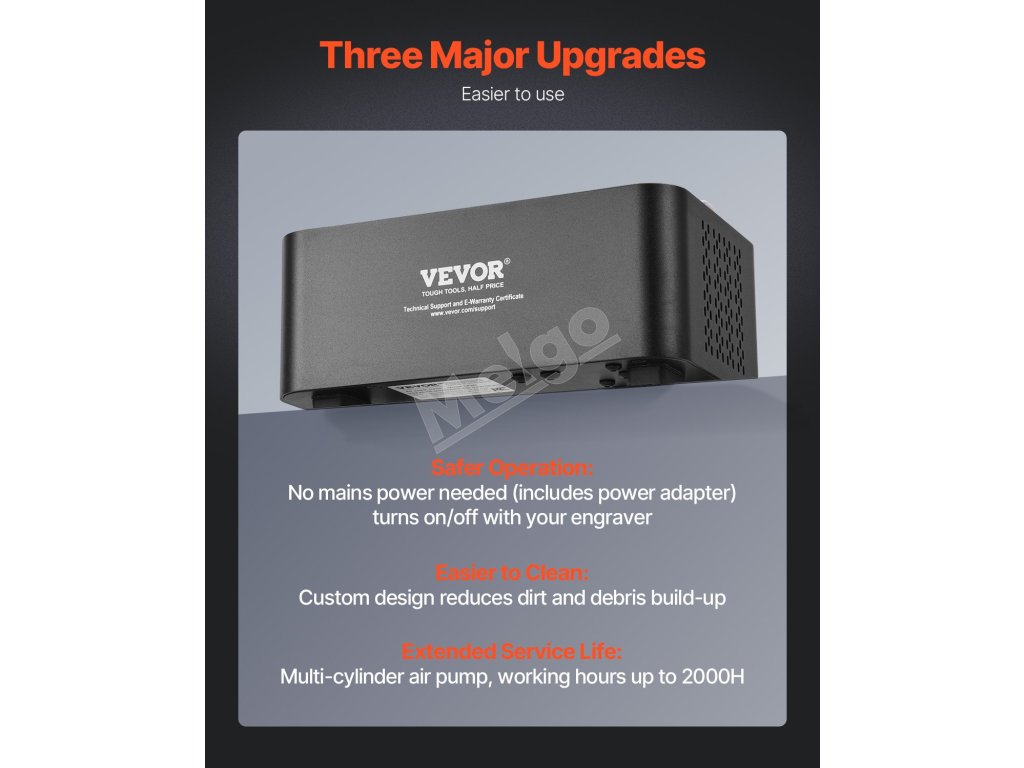 Toto vzduchové čerpadlo ľahko odfúkne dym a nečistoty, čím predĺži životnosť vášho laserového modulu. Nastaviteľný prietok vzduchu 50 l/min znižuje povrchovú teplotu, čím zabezpečuje čistú reznú hranu. Kompatibilné s laserovými gravírkami VEVOR a inými značkami ≥ 20 W.
