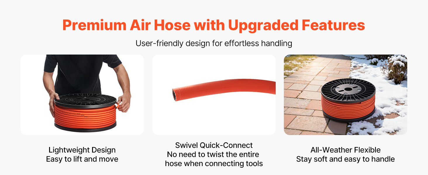 Táto ľahká pneumatická hadica uľahčuje premiestňovanie a manipuláciu. Jej otočná rukoväť umožňuje rýchle pripojenie bez krútenia hadice, zatiaľ čo pružný materiál vhodný do každého počasia zabezpečuje bezproblémovú prevádzku pri akejkoľvek teplote. Vďaka plnému vonkajšiemu krytu je hadica uprataná a ľahko sa skladuje.