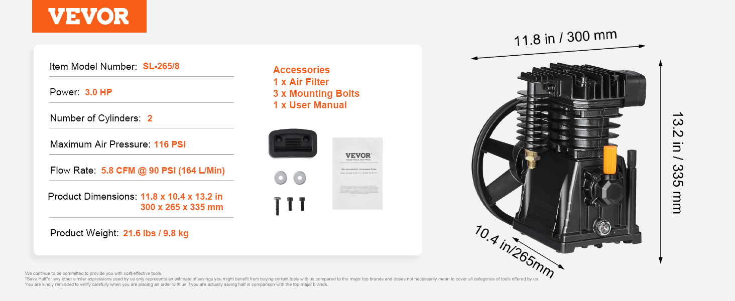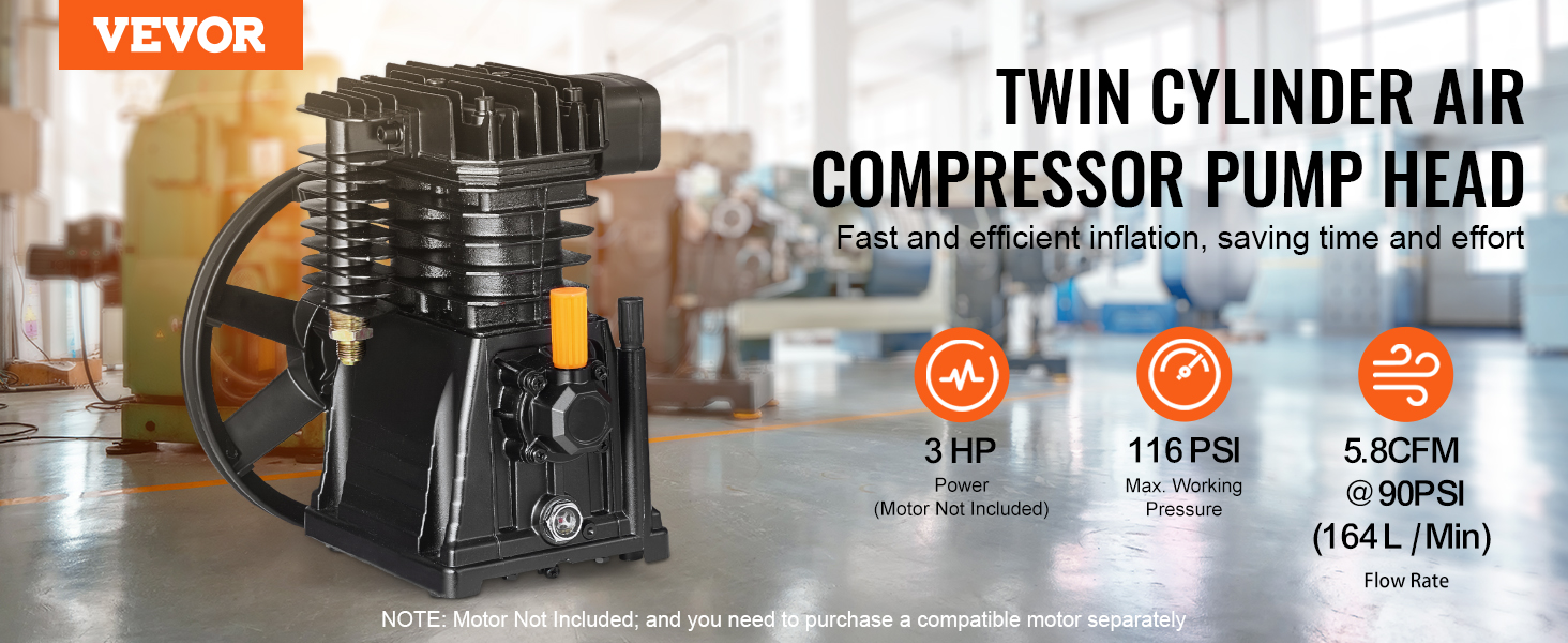 Dvojvalcová hlava čerpadla vzduchového kompresora VEVOR s výkonom 3 HP je riešením pre vaše pneumatické potreby. Môže sa pochváliť pôsobivým prietokom vzduchu 5,8 CFM pri 90 PSI, maximálnym pracovným tlakom 116 PSI a jednostupňovou kompresiou, vďaka čomu poskytuje stabilnú a bohatú dodávku vzduchu pre rôzne aplikácie.