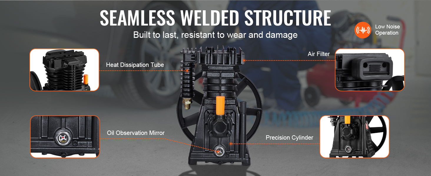 Táto hlava kompresorového čerpadla má bezšvovú zváranú konštrukciu, ktorá ponúka vynikajúcu odolnosť proti opotrebovaniu a toleranciu poškodenia, vďaka čomu je schopná vydržať dlhodobé používanie. Je vybavená okienkom na pozorovanie oleja, ktoré používateľom umožňuje ľahko sledovať hladinu oleja.