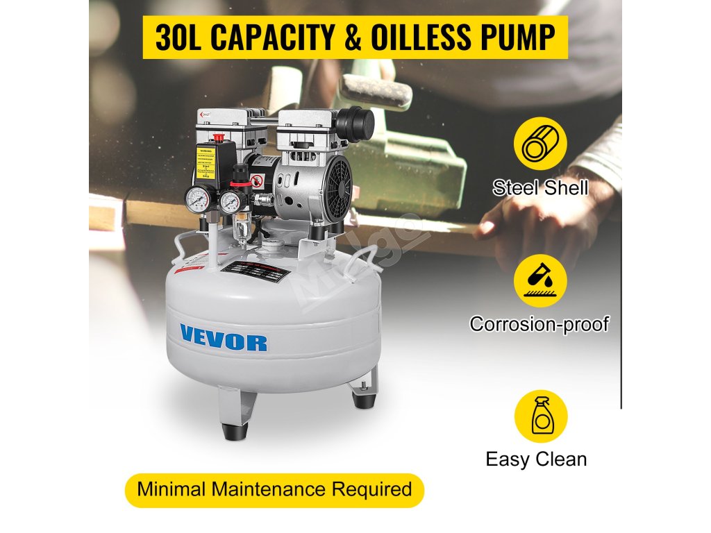 Vzduchový kompresor má 30L nádrž na maximalizáciu výkonu pneumatického náradia. Okrem toho je vybavený bezolejovým čerpadlom pre minimálnu údržbu.