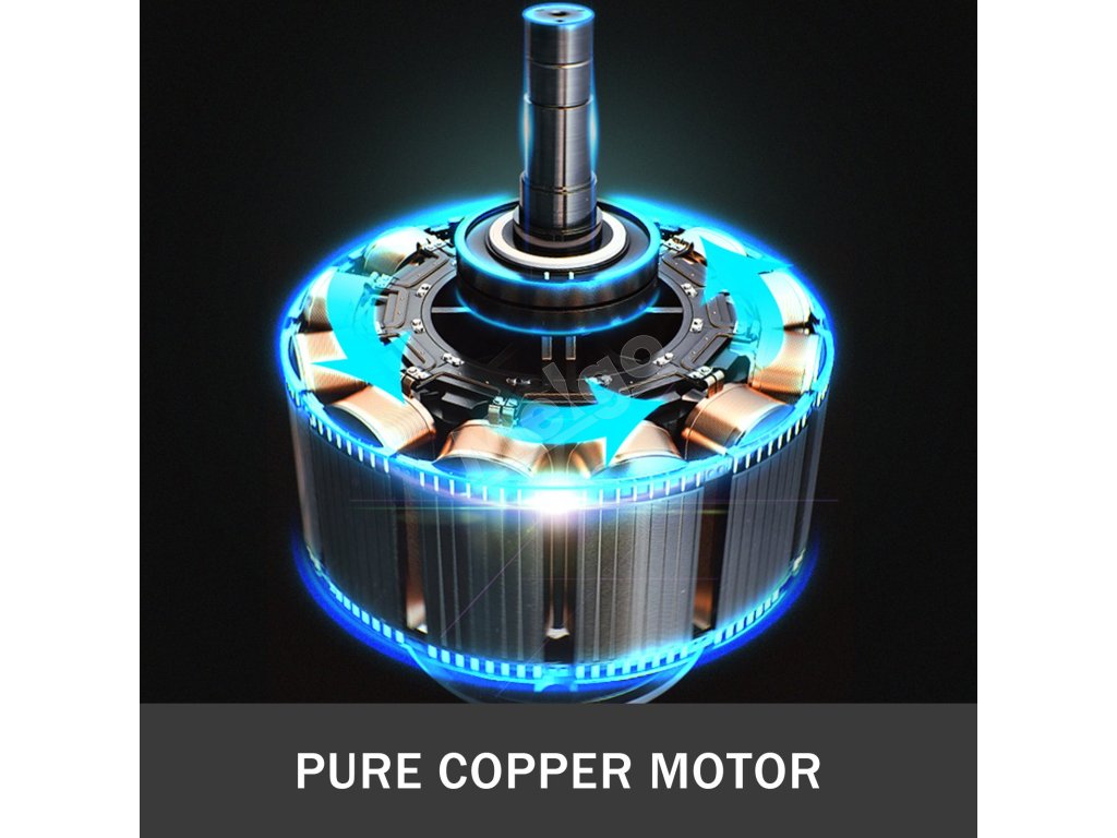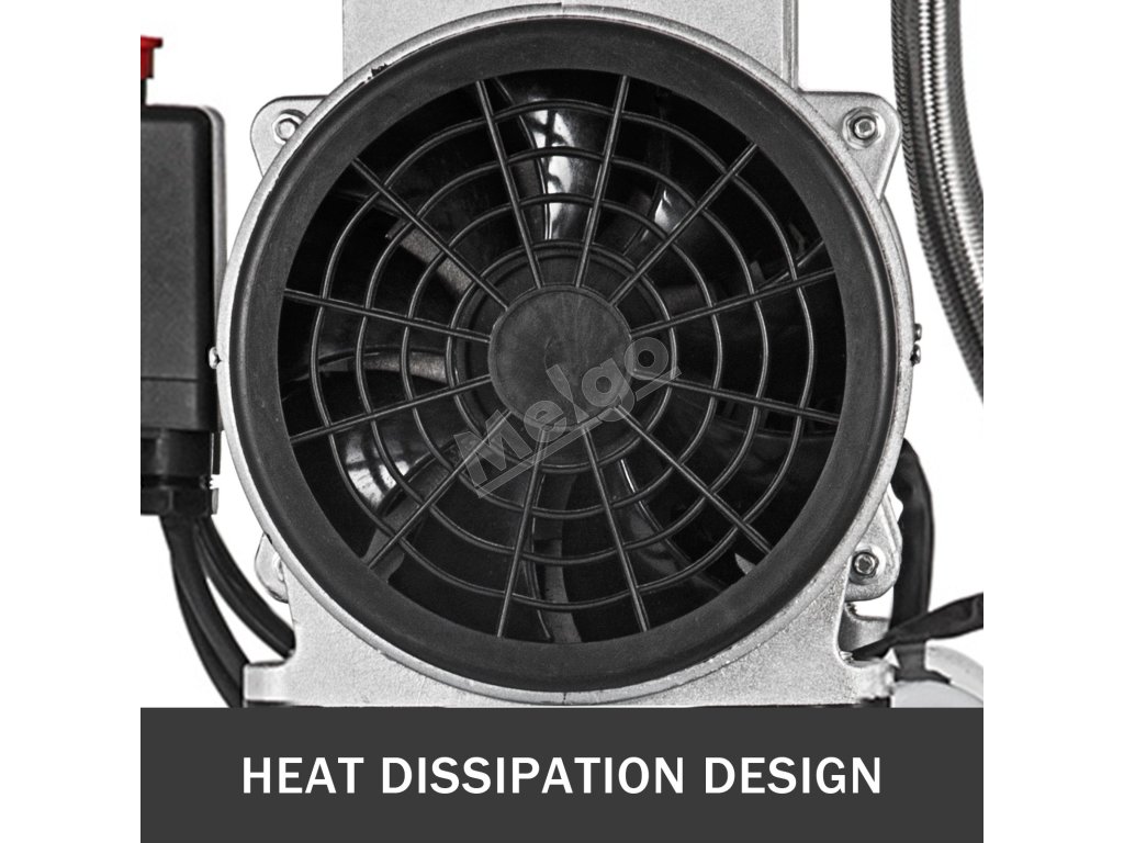Tento kompresor využíva medený motor s výkonom 1,1 HP/850 W, ktorý je vysoko účinný a tichý, ventilačný otvor na odvod tepla navrhnutý tak, aby zabránil prehriatiu, tlak: 115 psi, rýchlosť otáčania: 1440 ot.