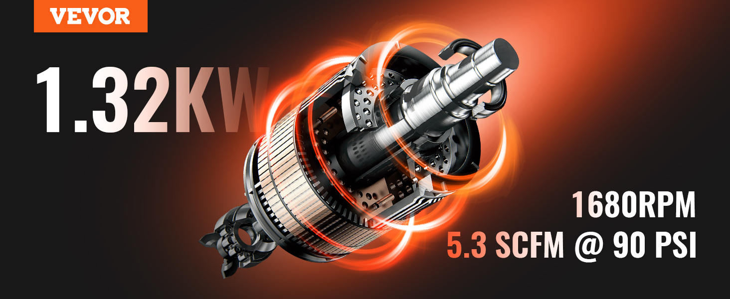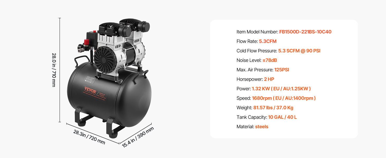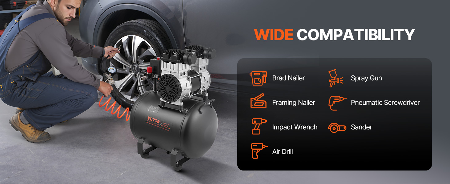 Tento horizontálny vzduchový kompresor má bezolejový motor s výkonom 2 HP, ktorý poskytuje dostatočný výkon na splnenie požiadaviek rôznych pneumatických nástrojov. Ponúka dostatočnú podporu vzduchu a výkonu na klincovanie, maľovanie a iné aplikácie.