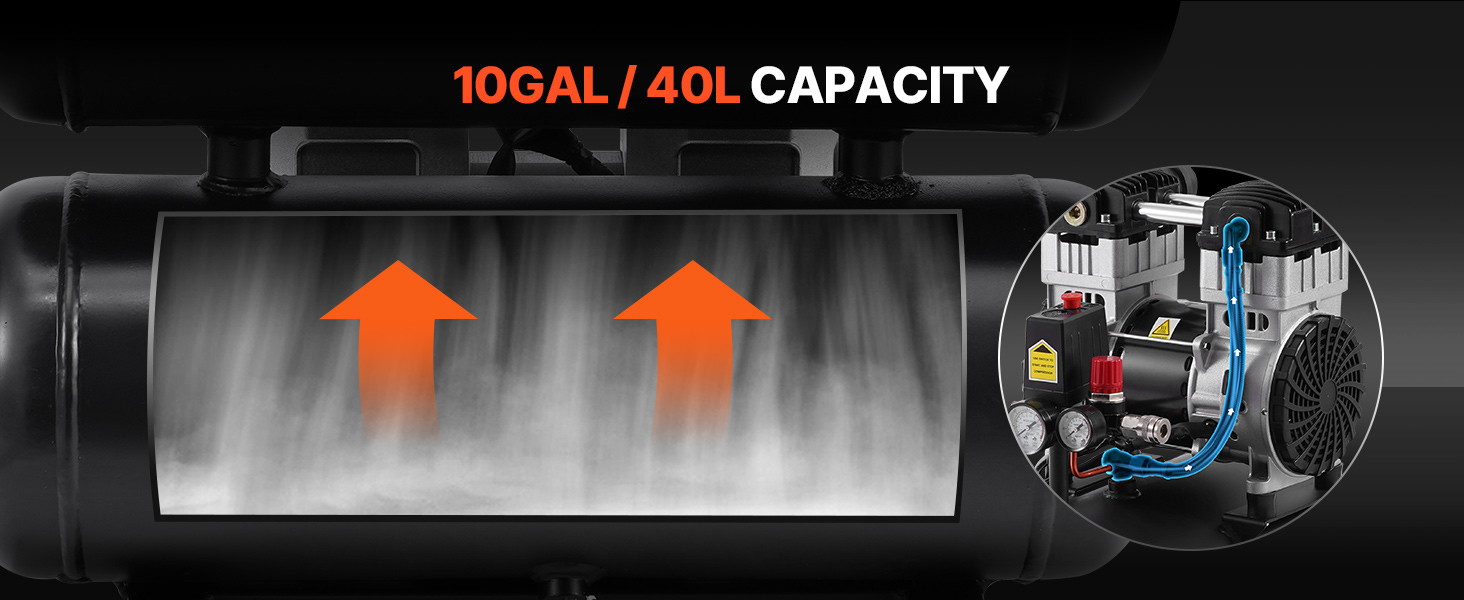 Tento horizontálny vzduchový kompresor sa dodáva s veľkokapacitnou nádržou na vzduch s objemom 10 galónov, ktorá poskytuje dostatočnú vzduchovú rezervu. Zabezpečuje nepretržitú a stabilnú dodávku vzduchu počas dlhých a intenzívnych pracovných úkonov.
