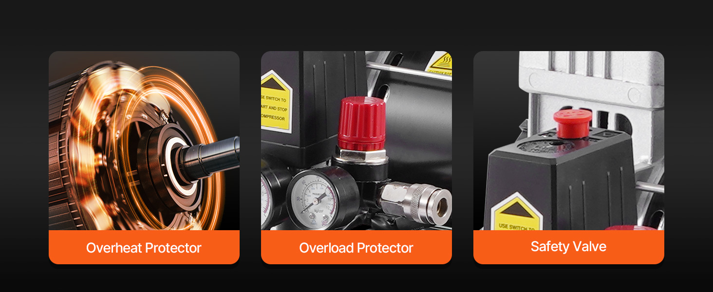 Ochrana proti prehriatiu automaticky preruší napájanie, keď je teplota príliš vysoká. Chránič proti preťaženiu poskytuje ochranu, keď je prúd príliš vysoký. Bezpečnostný ventil automaticky uvoľní tlak, keď je príliš vysoký. Tieto konštrukcie ponúkajú používateľom spoľahlivý zážitok.