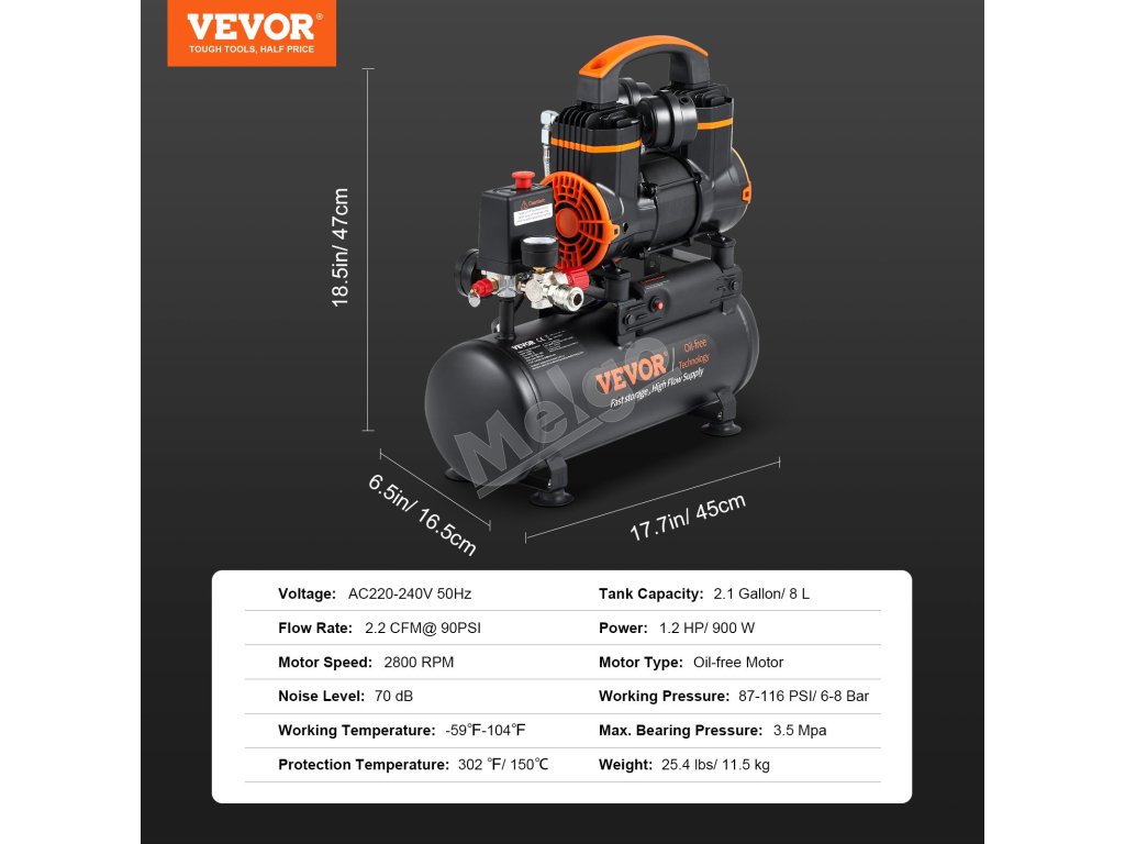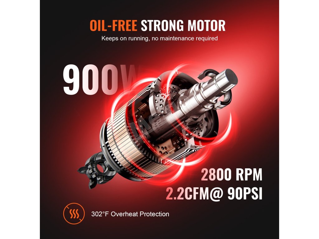 Pripravte sa na to, aby ste boli pripravení na každú výzvu! Náš bezolejový vzduchový kompresor s objemom 2,1 galóna dokáže splniť viacero scenárov, ako je hustenie pneumatík, oprava automobilov, maľovanie sprejom, pribíjanie klincov do dreva atď. Silný 900W motor s rýchlosťou 2800 ot/min a dodávkou vzduchu 2,2 CFM@ 90PSI dokáže rýchlo naplniť nádrž.