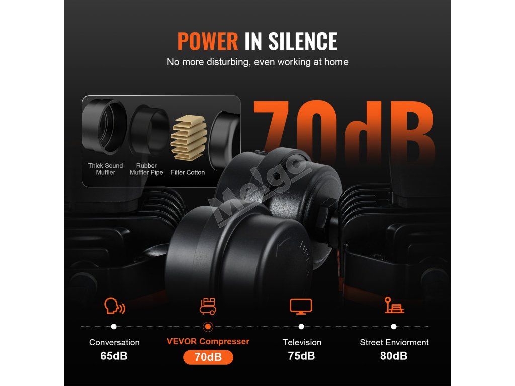 mimoriadne tichý kompresor s hlučnosťou 70 dB pracuje s nízkou hlučnosťou. Zabudovaná filtračná vata a tlmič hluku znižujú hluk a zároveň zabraňujú vnikaniu jemného prachu.