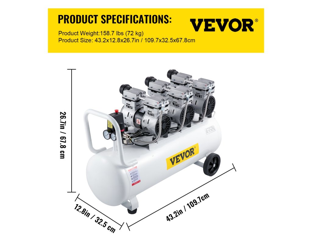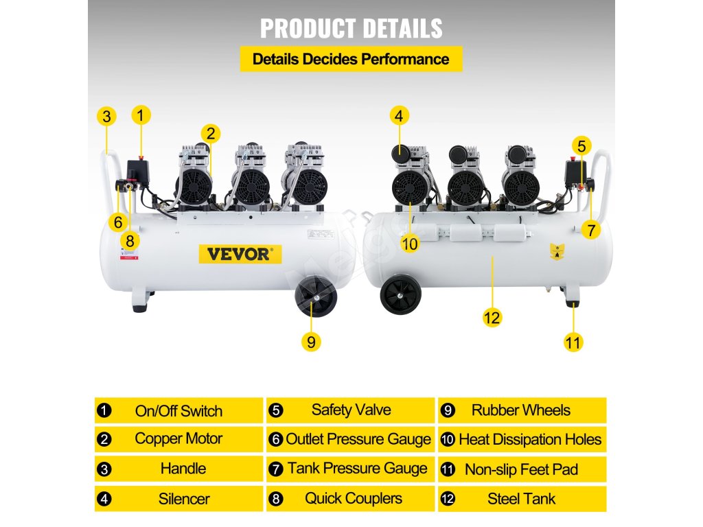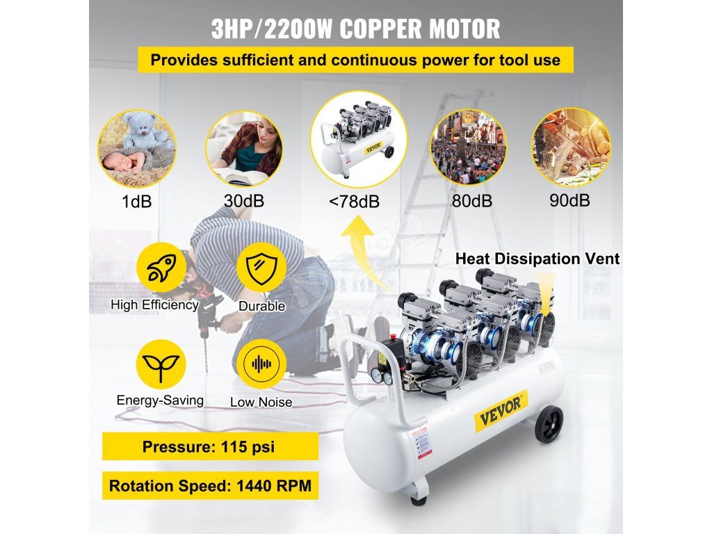 Tento kompresor využíva medený motor s výkonom 3 HP/2200 W, ktorý je vysoko účinný a tichý, ventilačný otvor na odvod tepla navrhnutý tak, aby zabránil prehriatiu, tlak: 115 psi, rýchlosť otáčania: 1440 ot.