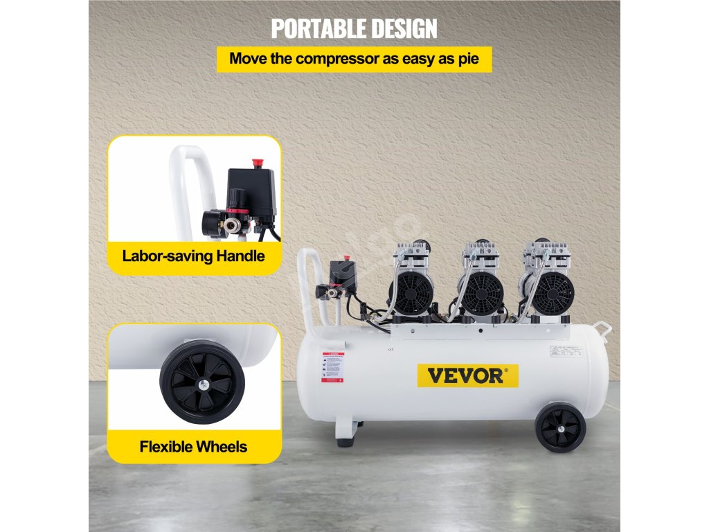 Vzduchový kompresor má 2 kolieska a rukoväť na ľahké premiestňovanie a prepravu, 2 protišmykové podložky pod nohy na stabilitu počas práce. Je pre vás hračkou vziať kompresor kamkoľvek so sebou.