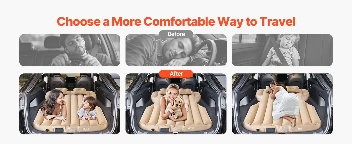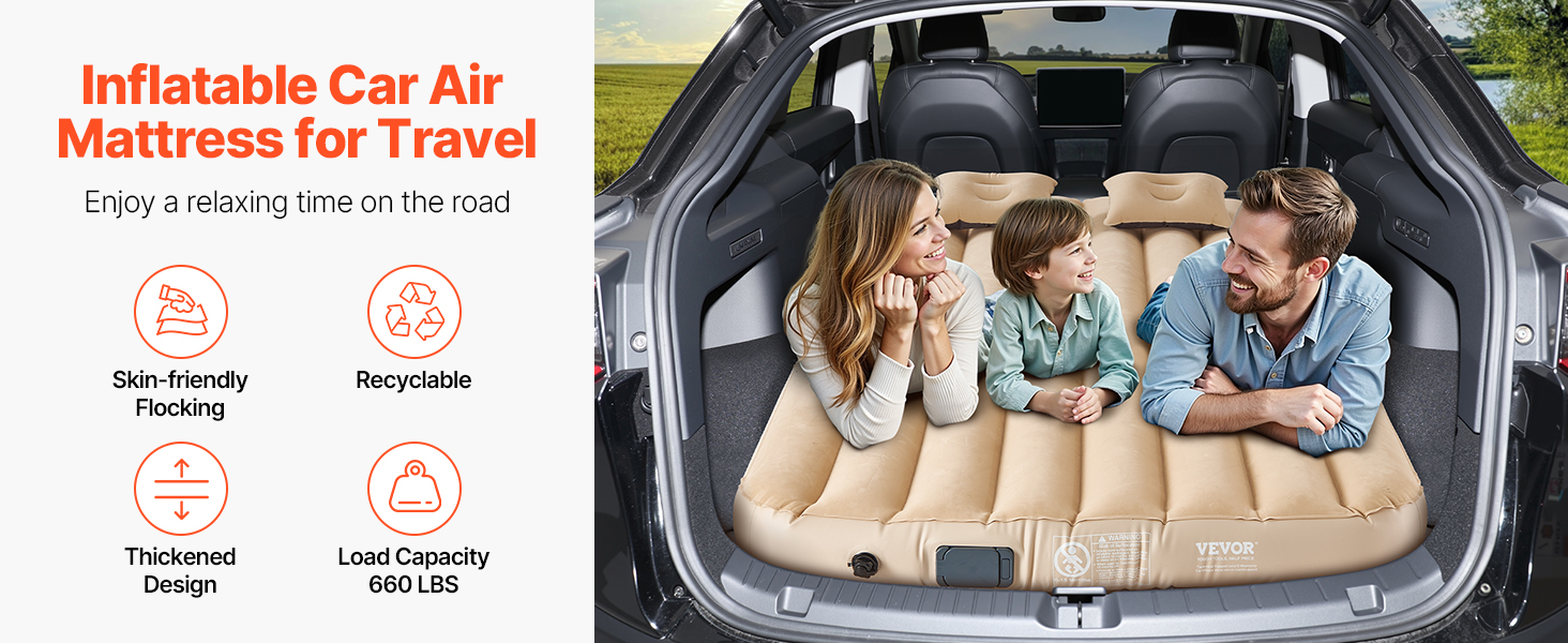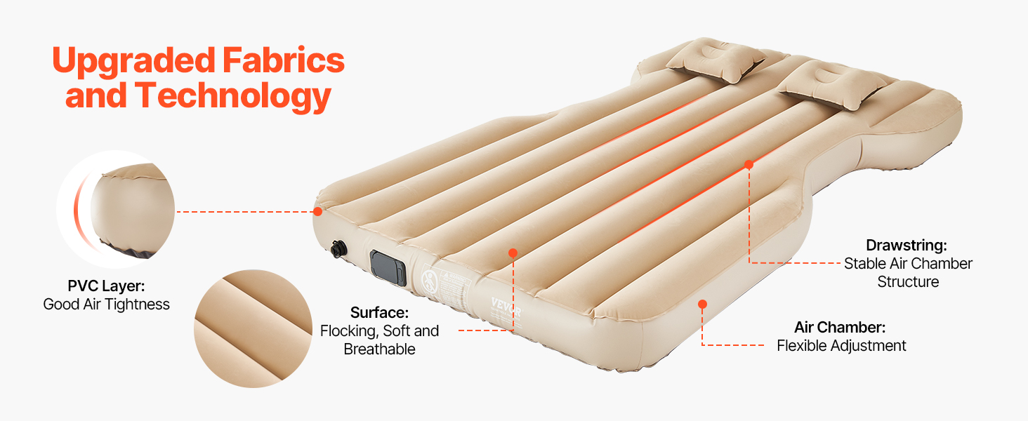 Nafukovací matrac do auta je vyrobený s mäkkým a pohodlným flokovaným povrchom a vysokokvalitným PVC, ktoré v sebe spájajú odolnosť voči vode, a estetický vzhľad. Ergonomický dizajn poskytuje tlmiace a nárazové účinky, pričom vynikajúca vzduchotesnosť zaručuje nerušený odpočinok.