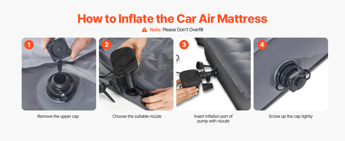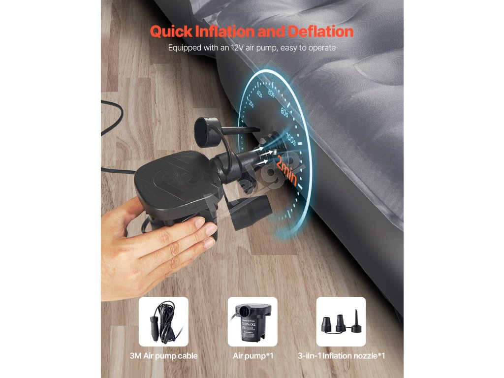 Nafúknutie nafukovacieho kempingového matraca do auta trvá len 2 minúty, čo vám umožní rýchlo ho začať používať. Matrac je vybavený externou vzduchovou pumpou a tryskou tri v jednom na jednoduchú obsluhu. Vzduchová pumpa je vybavená 3 metre dlhým káblom, ktorý umožňuje nafukovanie na veľké vzdialenosti.