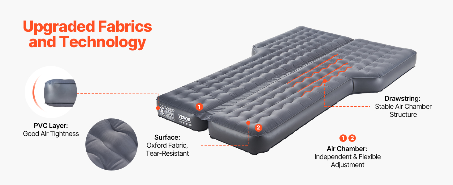 Rýchlo nafukovacia cestovná posteľ je vyrobená s povrchom z oxfordskej tkaniny a vysokokvalitného PVC materiálu, ktorý kombinuje trvanlivosť, odolnosť voči vode a estetický vzhľad. Ergonomický dizajn poskytuje tlmiace a nárazové účinky. Vďaka vynikajúcej vzduchotesnosti zaručuje nerušený odpočinok.