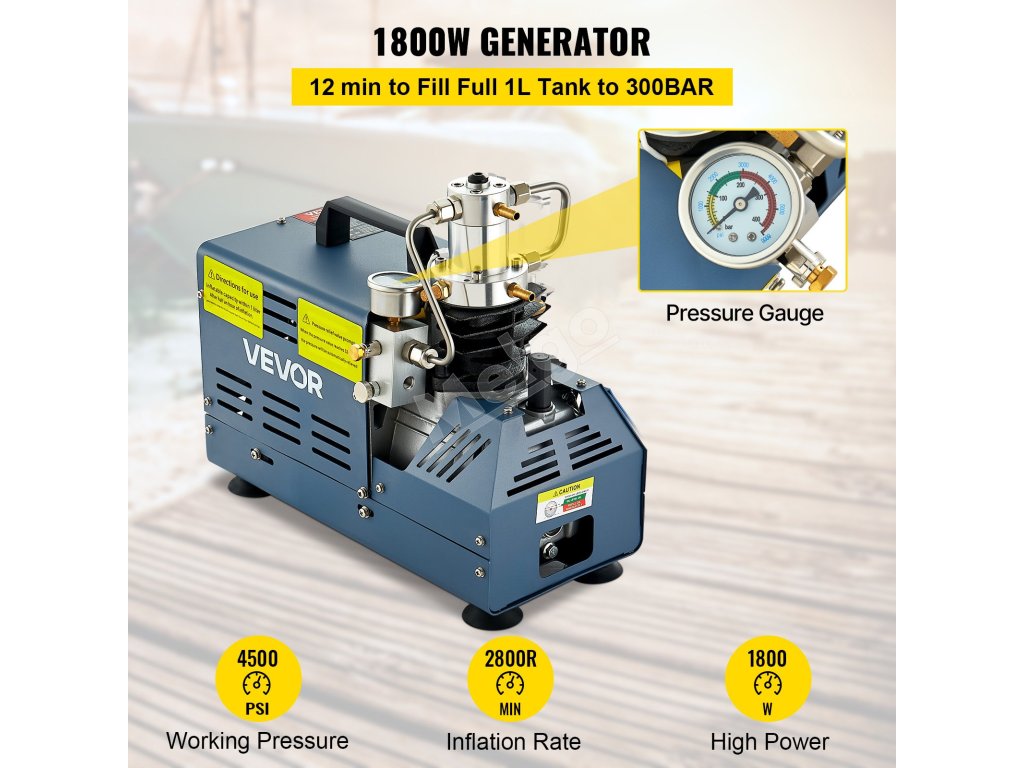 Tento kompresor na potápanie s nádržou je vybavený 1800W vysoko výkonným medeným motorom a vynikajúcim nafukovacím výkonom. Maximálny pracovný tlak je 4500 PSI, rýchlosť nafukovania je 2800 R/min a prietok je 50 l/min. Keď tlak dosiahne 30MPA, je potrebné zariadenie manuálne zastaviť.