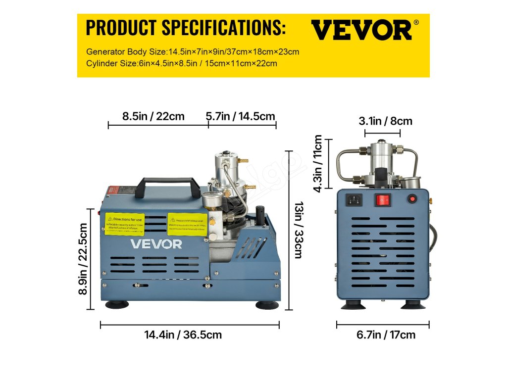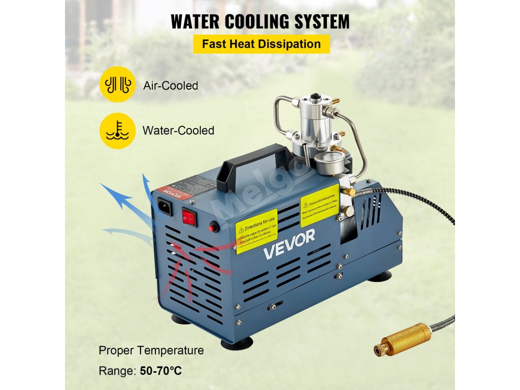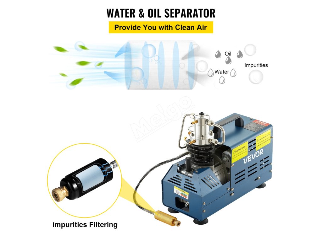 Obsahuje filtračný systém, ktorý pomáha odstraňovať nečistoty. Ak potrebujete plniť potápačské nádrže, pridajte na výstup filter na čistenie vzduchu. vhodné pre mini potápačskú fľašu, PCP pušku, paintballovú nádrž, vzduchovú pištoľ, paintballovú vzduchovku, hasenie požiarov, zisťovanie úniku.