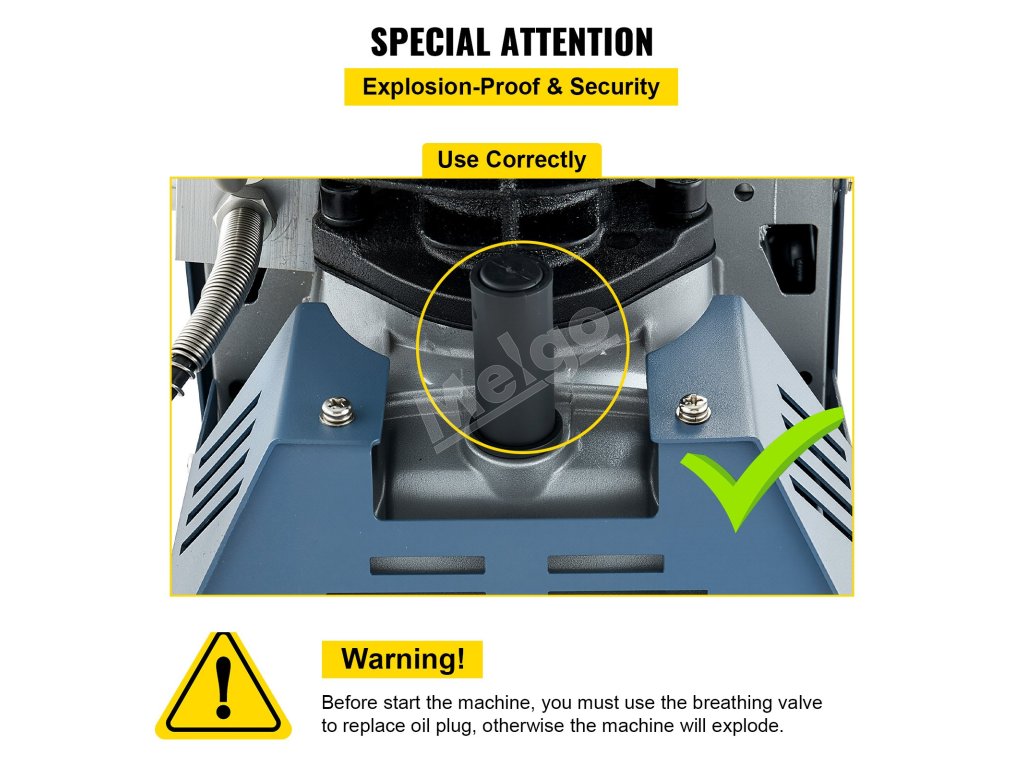 Tento potápačský kompresor je vylepšený o odolné kovové ploty v prednej časti a vedľa tela stroja. Stroj je tiež vybavený konštrukciou odolnou proti výbuchu, ktorá poskytuje vašu bezpečnosť v rôznych aspektoch. Upozornenie: V prípade, že je kompresor v prevádzke, je možné ho použiť ako ochranný prvok: Pred spustením stroja vymeňte olejovú zátku na dýchací ventil, inak zariadenie exploduje.