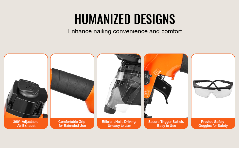 Pneumatická rámová klincovačka VEVOR MCN90 je kompatibilná s drôtenými klincami v dĺžke od 1-3/4" do 3-1/2". Perfektne sa hodí na úlohy súvisiace s domácimi úpravami a opravami, vyniká pri stavbe drevených rámov, inštalácii stien, podláh alebo montáži plotov a vonkajších terás.