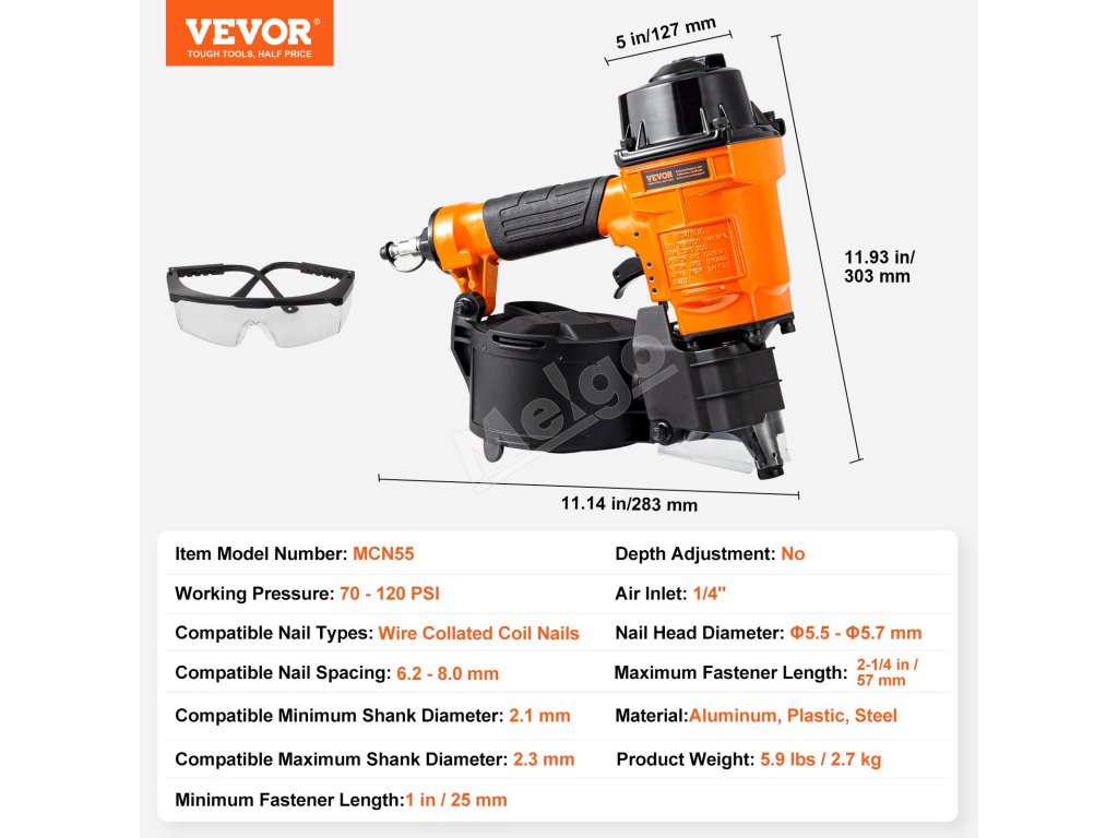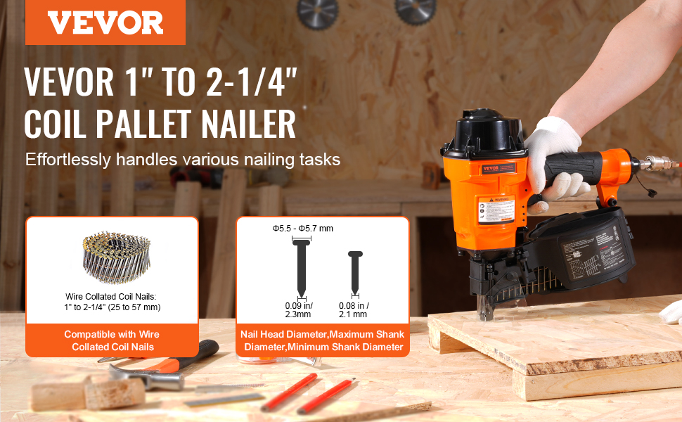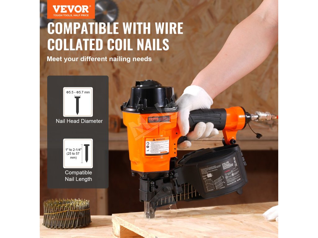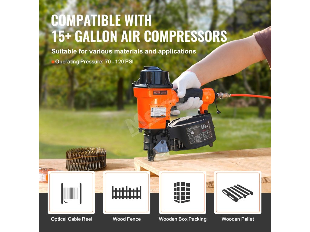 Pneumatická klincovačka VEVOR MCN55 je kompatibilná s drôtenými klincami v dĺžke od 1 do 2-1/4 palca. Perfektne sa hodí na domáce zlepšovacie a opravárenské práce, vyniká pri montáži drevených obalov, drevených paliet, dreveného nábytku, navíjania optických káblov, plotov a ďalších.