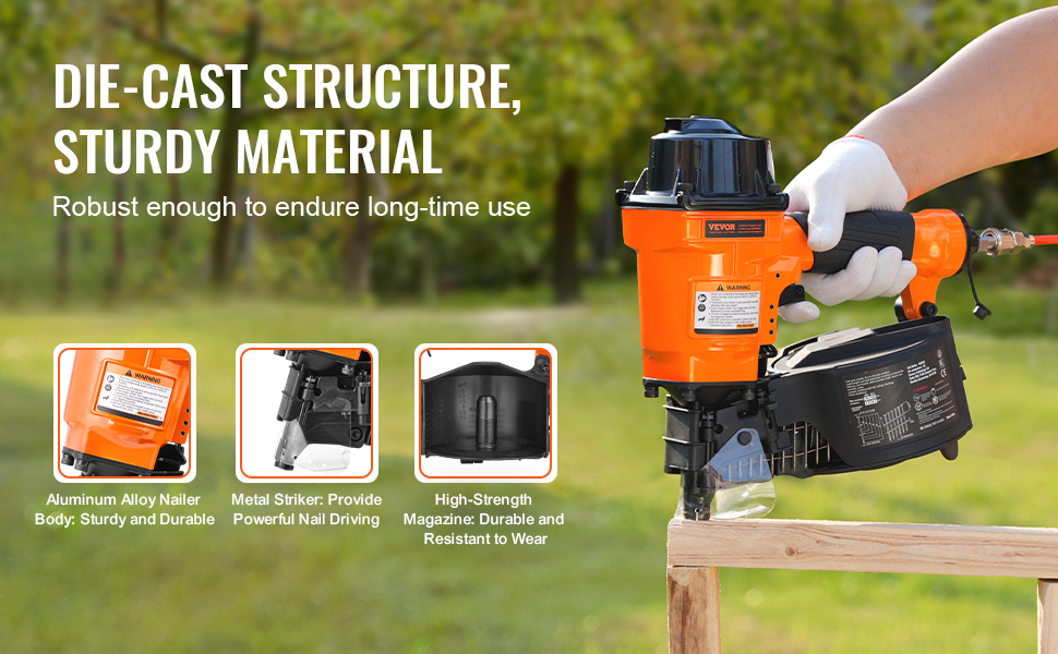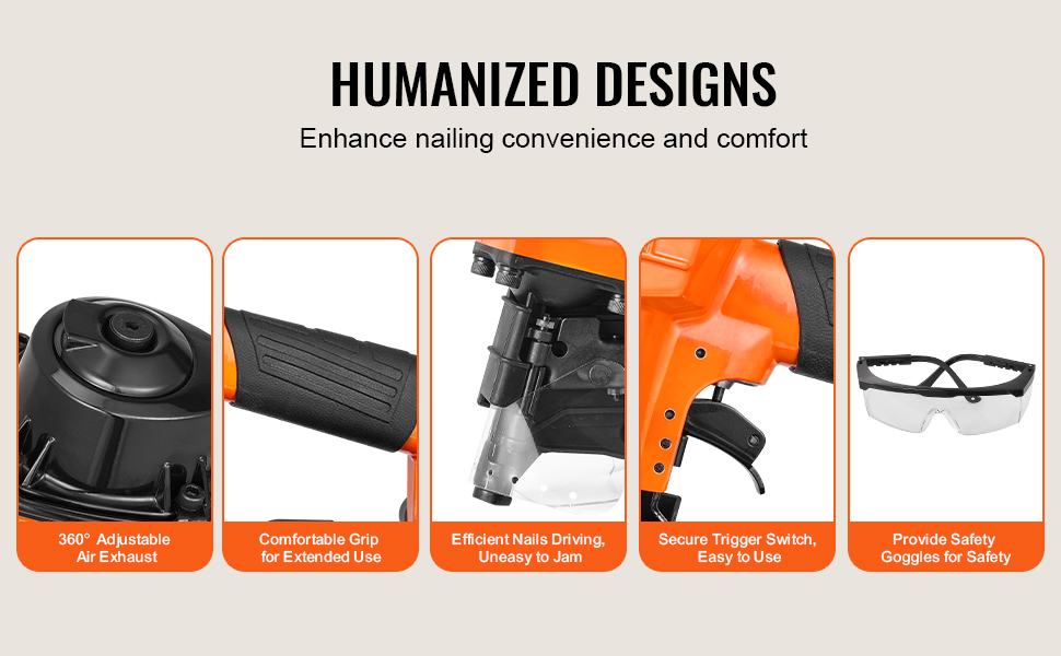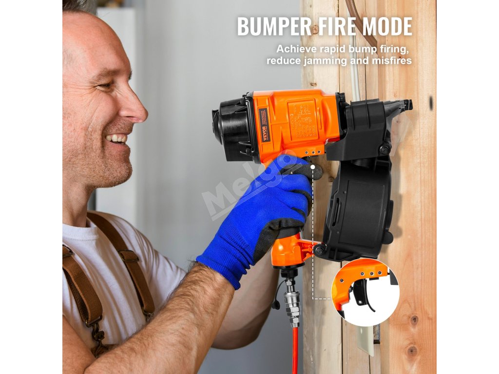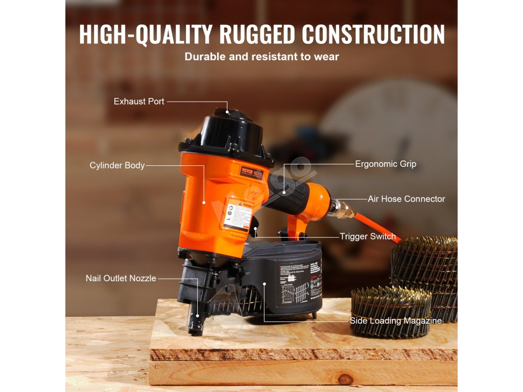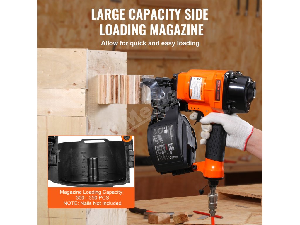 Pneumatická klincovačka VEVOR MCN55 je kompatibilná s drôtenými klincami v dĺžke od 1 do 2-1/4 palca. Perfektne sa hodí na domáce zlepšovacie a opravárenské práce, vyniká pri montáži drevených obalov, drevených paliet, dreveného nábytku, navíjania optických káblov, plotov a ďalších.
