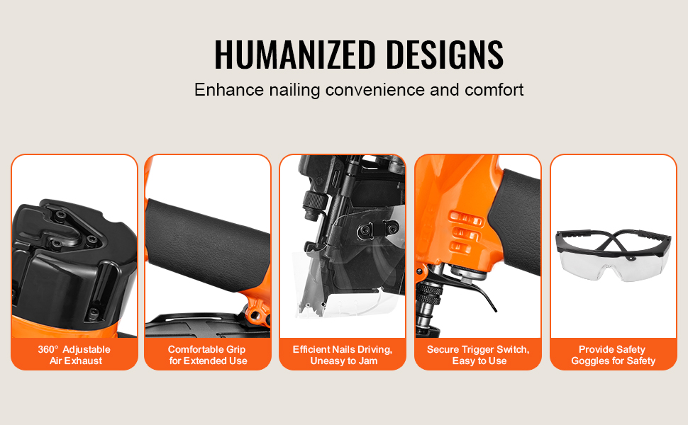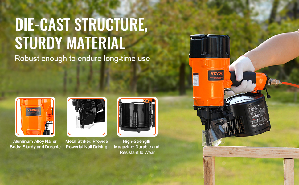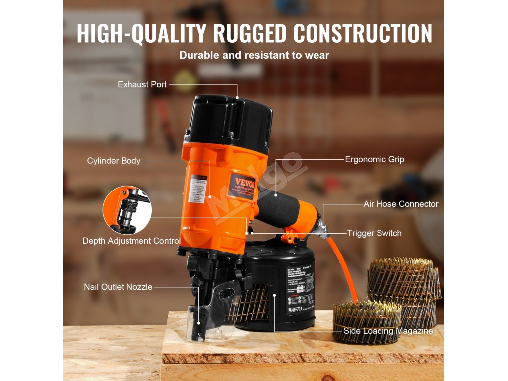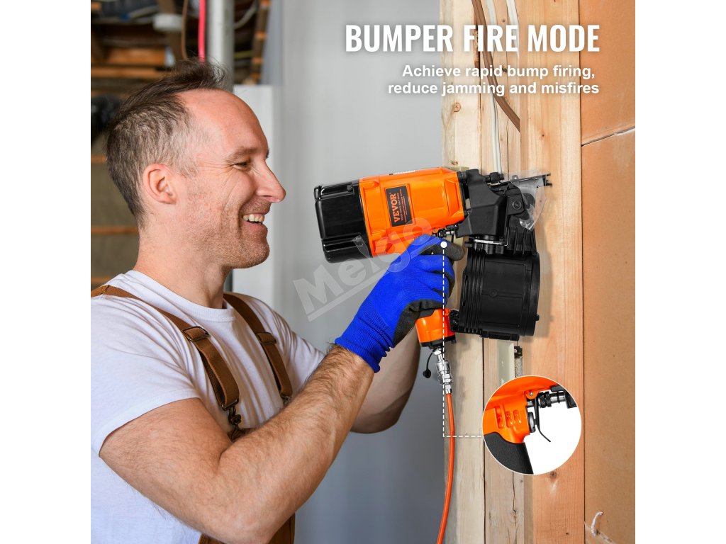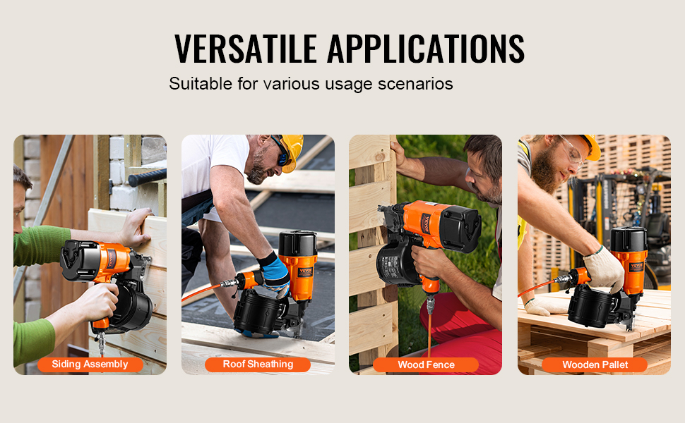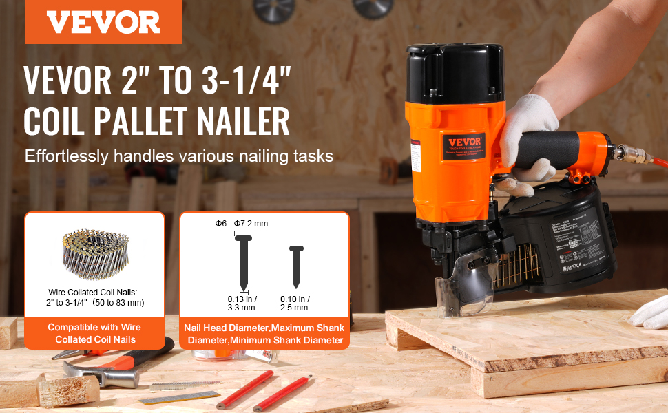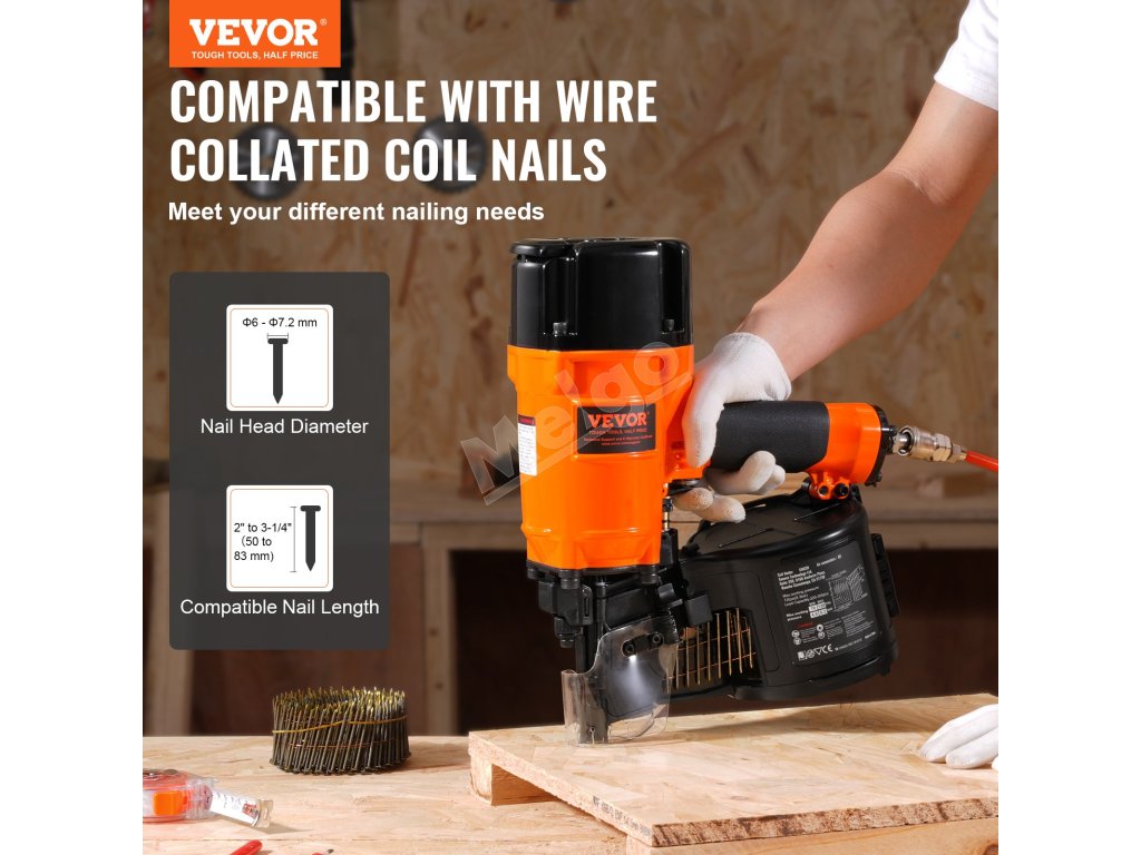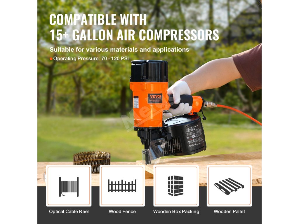 Pneumatická klincovačka VEVOR CN83N je kompatibilná s drôtenými klincami v dĺžke od 2" do 3-1/4". Dokonale sa hodí na úlohy súvisiace s domácimi úpravami a opravami, pričom vyniká v širokej škále aplikácií vrátane obkladov, opláštenia, opracovania dreva, oplotenia a paluboviek.