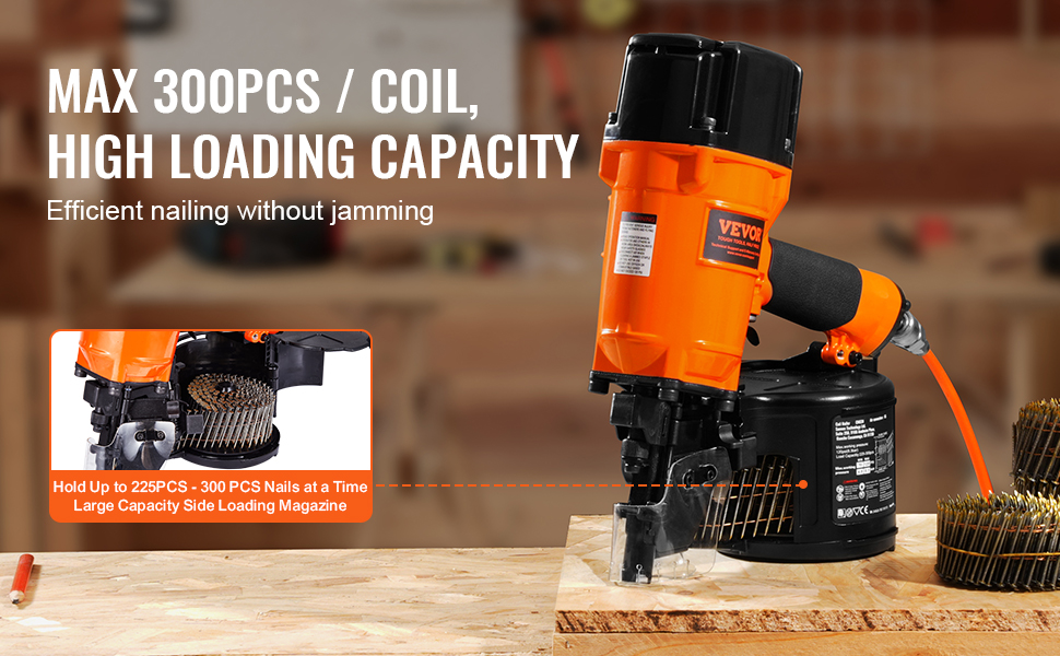 Táto vzduchová špirálová klincovačka, vybavená veľkokapacitným zásobníkom s bočným vkladaním, pojme naraz až 225-300 klincov. Táto vysoká kapacita zásobníka umožňuje dlhodobú a efektívnu prevádzku, čím sa minimalizuje potreba častého dobíjania a udržiava sa neprerušený pracovný tok.