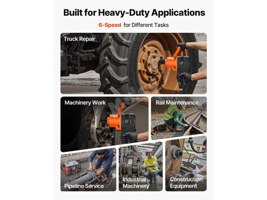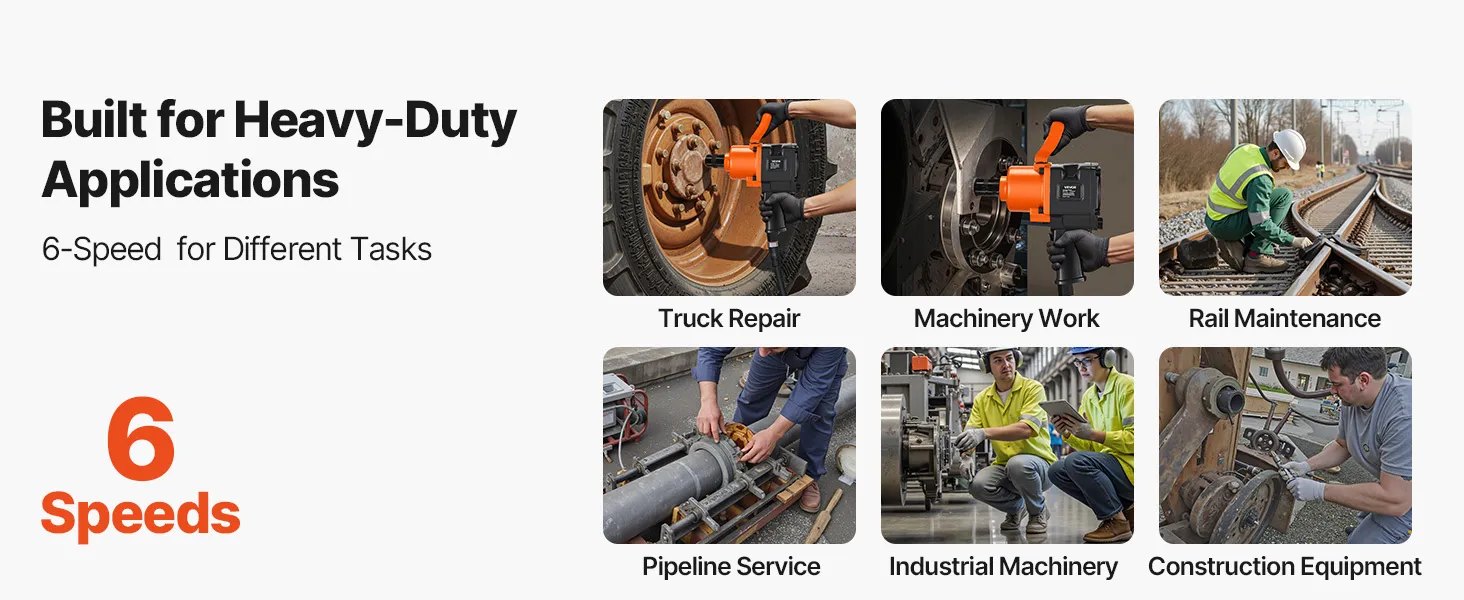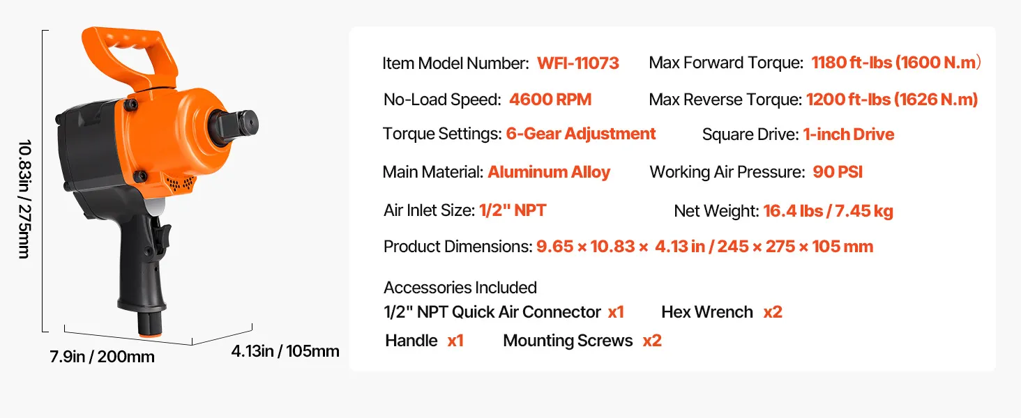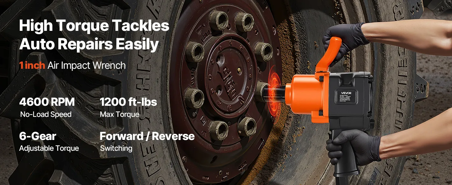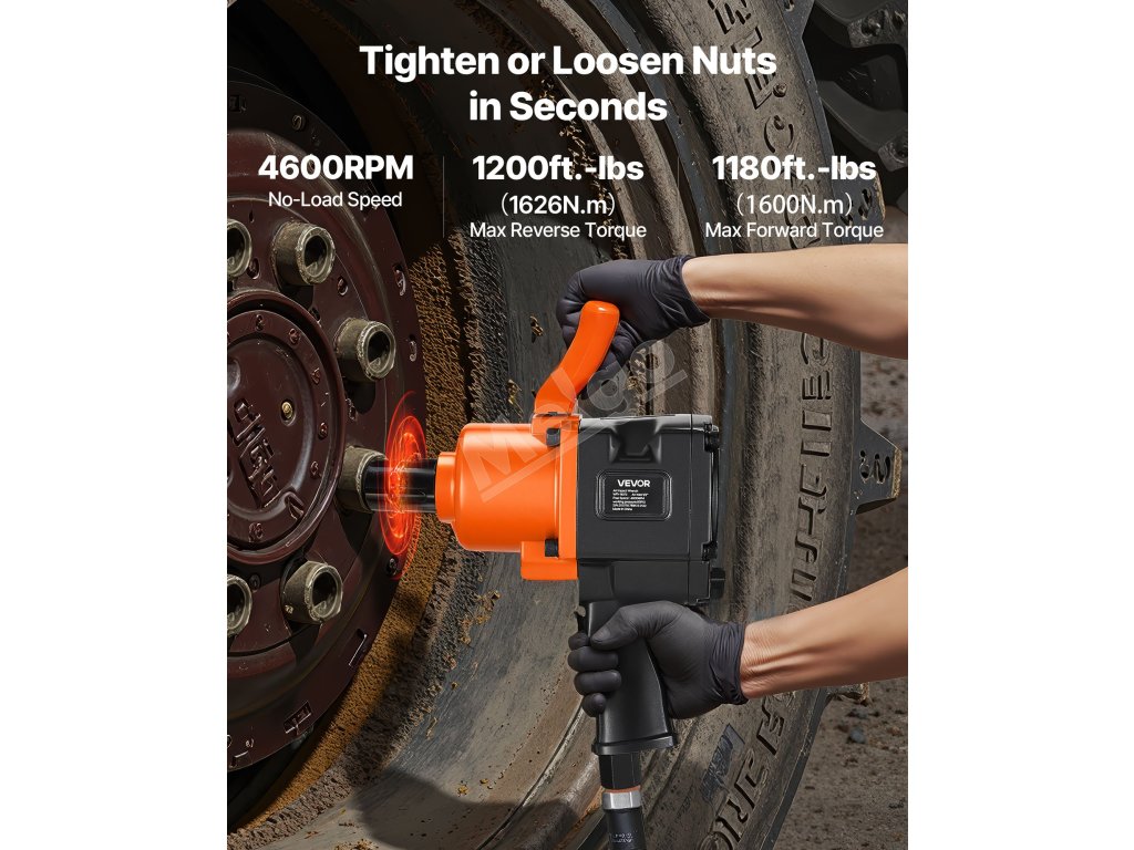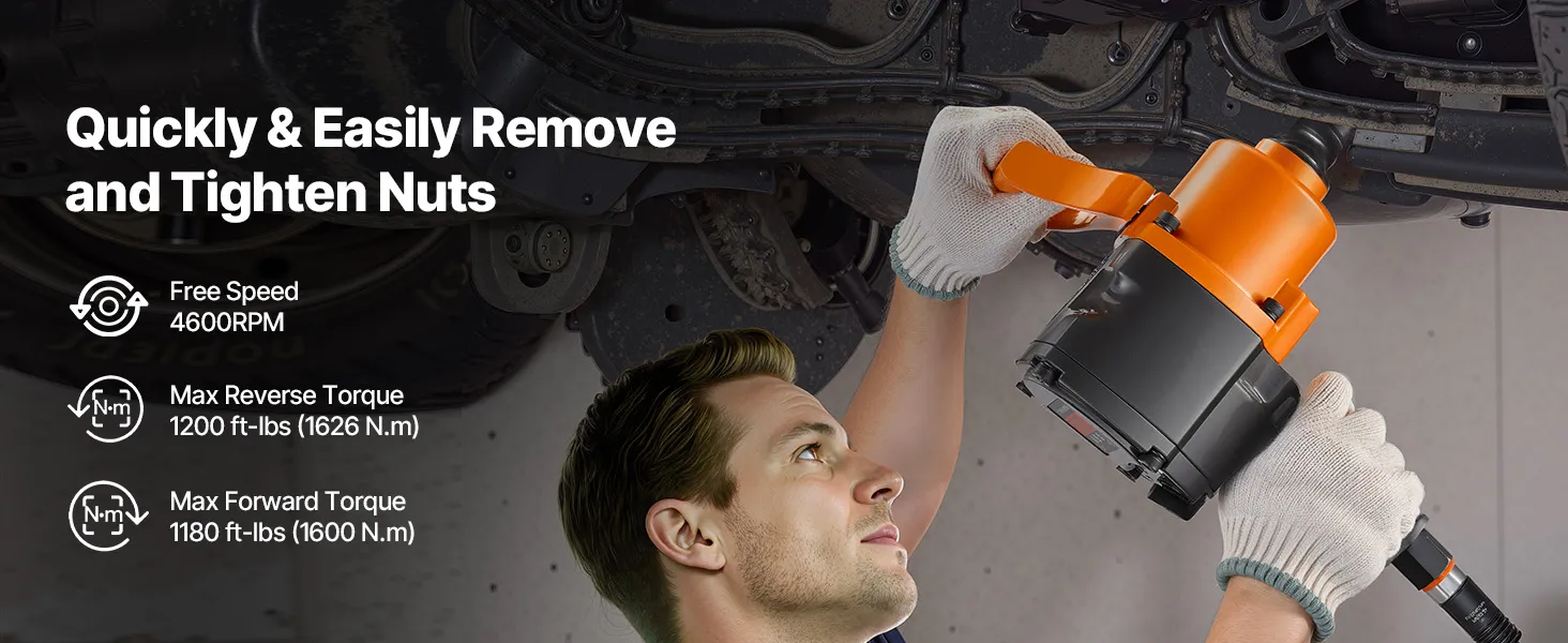Tento 1" pneumatický rázový uťahovák poskytuje vysoký spätný krútiaci moment až 1200 ft-lbs (1626 N.m) a voľnobežné otáčky 4600 ot/min. Ľahko uvoľňuje skrutky a matice, takže je ideálny na opravy a údržbu ťažkých automobilov, nákladných vozidiel, prívesov, autobusov, strojov a priemyselných zariadení.