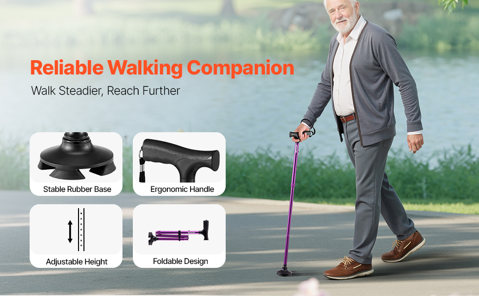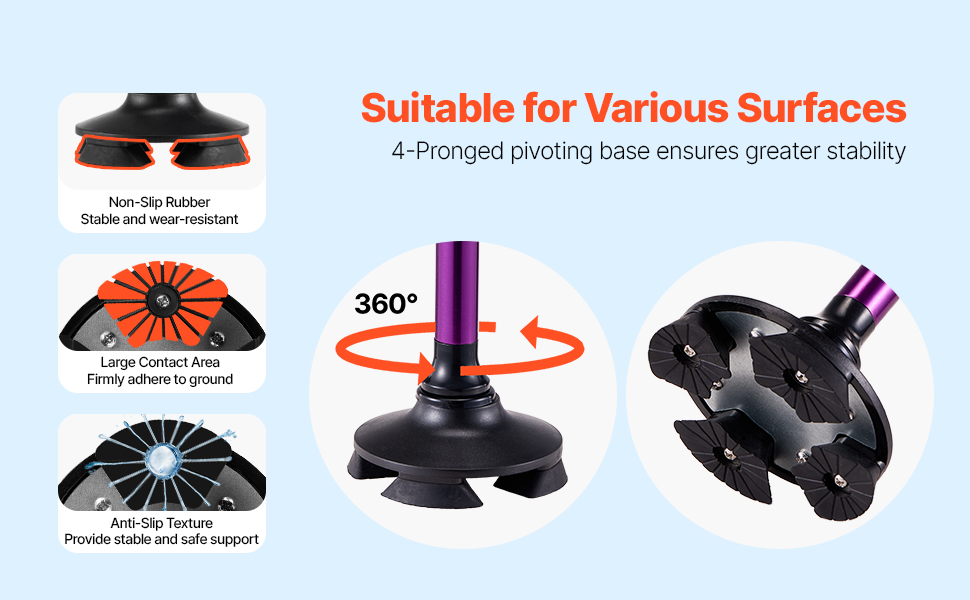 Táto hliníková prenosná ľahká vychádzková palica so 4-ramennou otočnou základňou s protišmykovými podložkami pod nohy ponúka vynikajúcu priľnavosť a stabilitu na tráve, štrku, drevených podlahách a dlaždiciach, čím zabezpečuje bezpečnú a stabilnú chôdzu v rôznych terénoch.