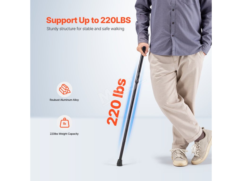 Táto vychádzková palica pre seniorov, vyrobená z vysokopevnostnej hliníkovej zliatiny, unesie až 220 kg a poskytuje výnimočnú stabilitu a spoľahlivosť. Je ideálna na každodenné používanie alebo na vonkajšie dobrodružstvá, zaručuje dlhodobý výkon a pokoj.
