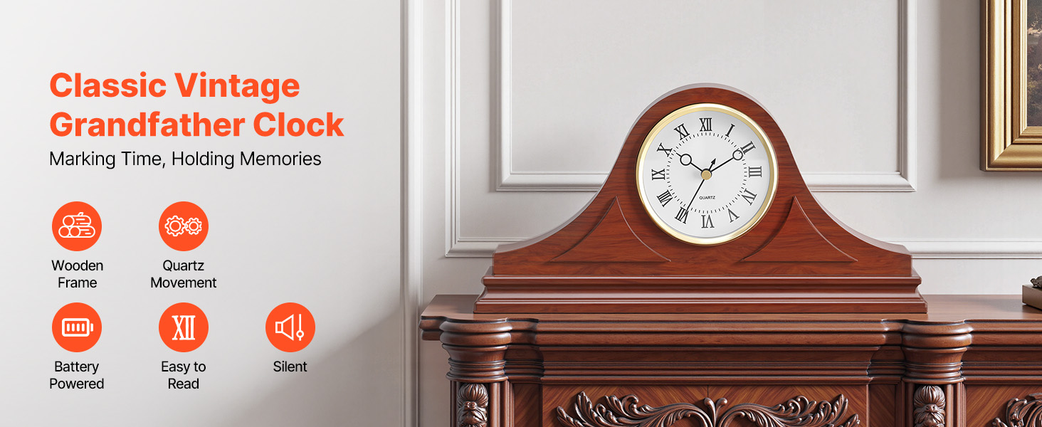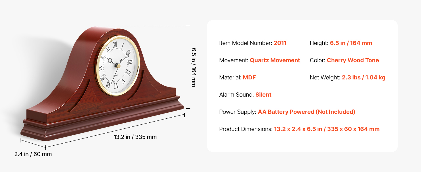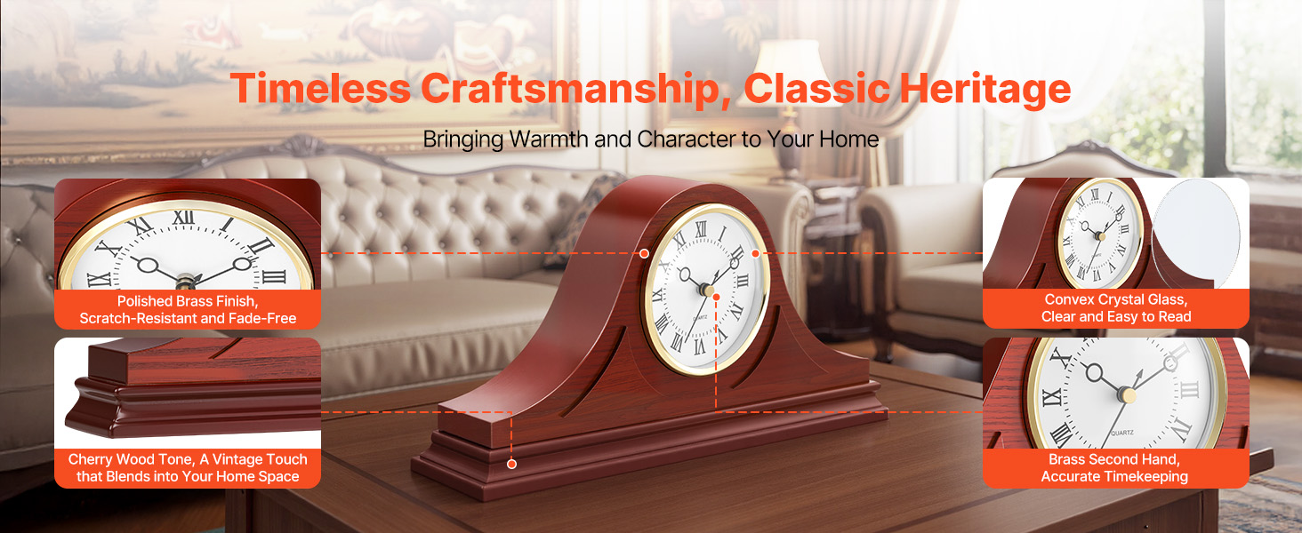 Tieto nostalgické krbové hodiny s priemerom 6,4 palca (162,5 mm) sa hodia do rôznych štýlov domov. Vďaka drevenému rámu s čerešňovou povrchovou úpravou sú odolné a ručne vyrobené pre eleganciu. Kremenný mechanizmus zabezpečuje presné meranie času s tichým dizajnom - ideálny darček na sviatky inšpirovaný prírodou.