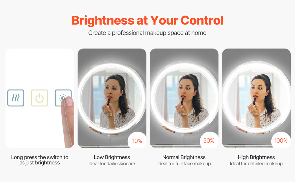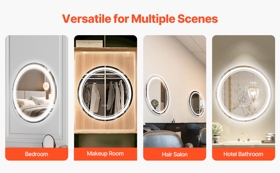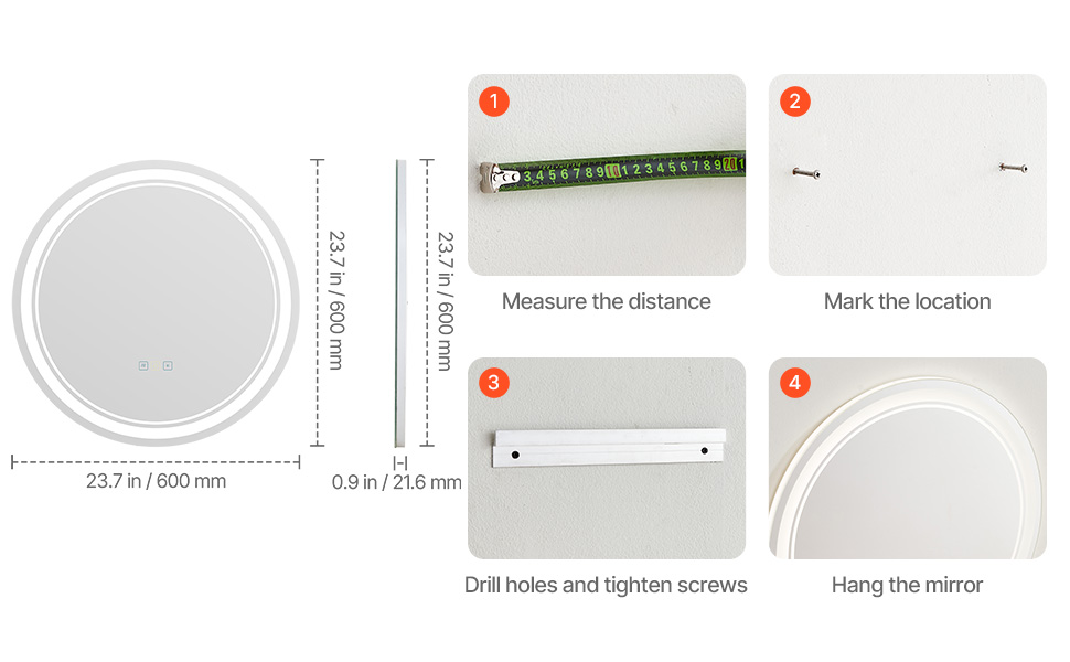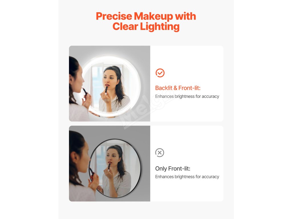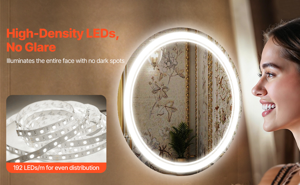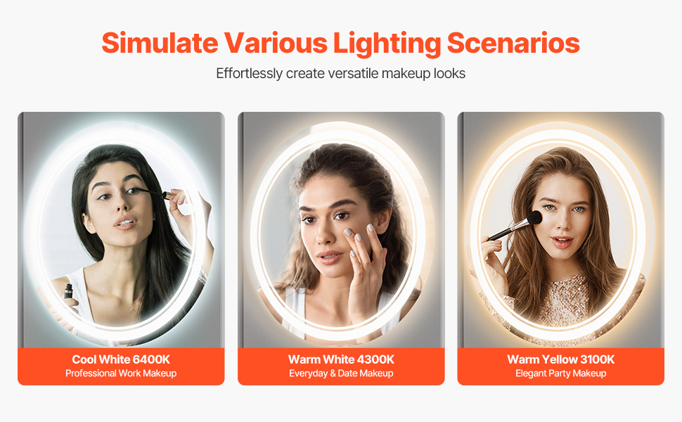 Toto kúpeľňové zrkadlo s led osvetlením simuluje rôzne svetelné atmosféry a umožňuje vám prepínať medzi studenou bielou, teplou bielou a teplou žltou farbou, aby ste vytvorili ideálne osvetlenie na prirodzené líčenie. Bez námahy spĺňa potreby osvetlenia pri rôznych príležitostiach.