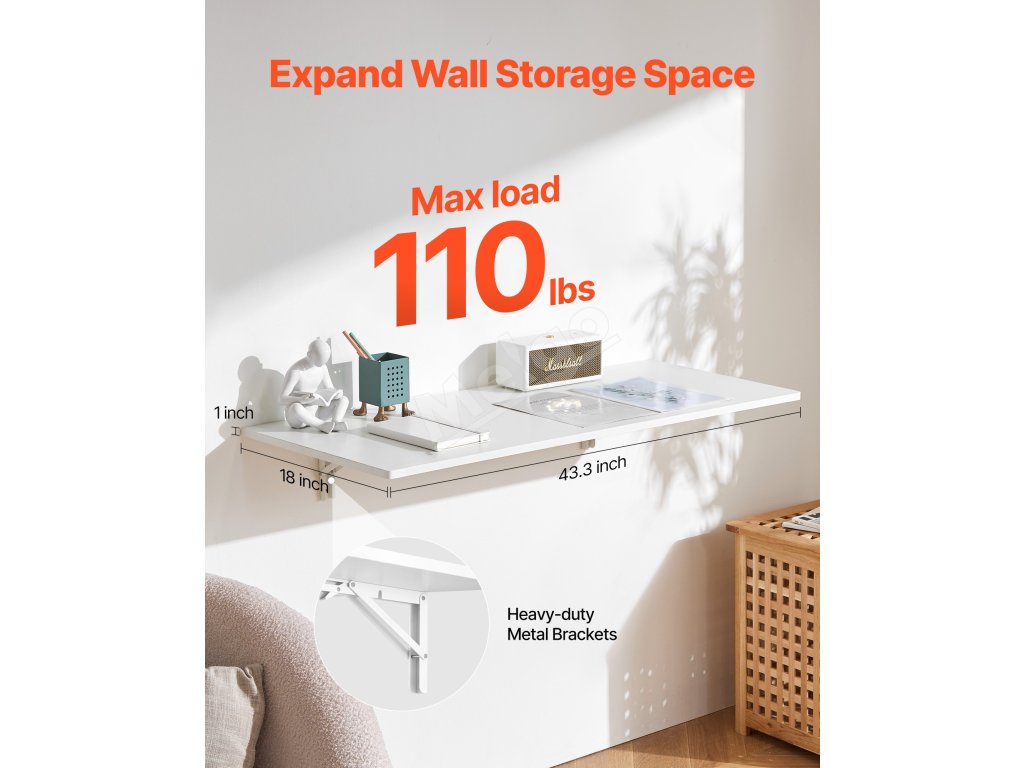 Tento nástenný stôl, navrhnutý s priestrannou plochou, spĺňa rôznorodé životné a pracovné potreby. Či už ako písací stôl alebo pracovná stanica, pohodlne sa naň zmestia dekorácie, knihy, notebooky a náradie a všetko bude prehľadne usporiadané.