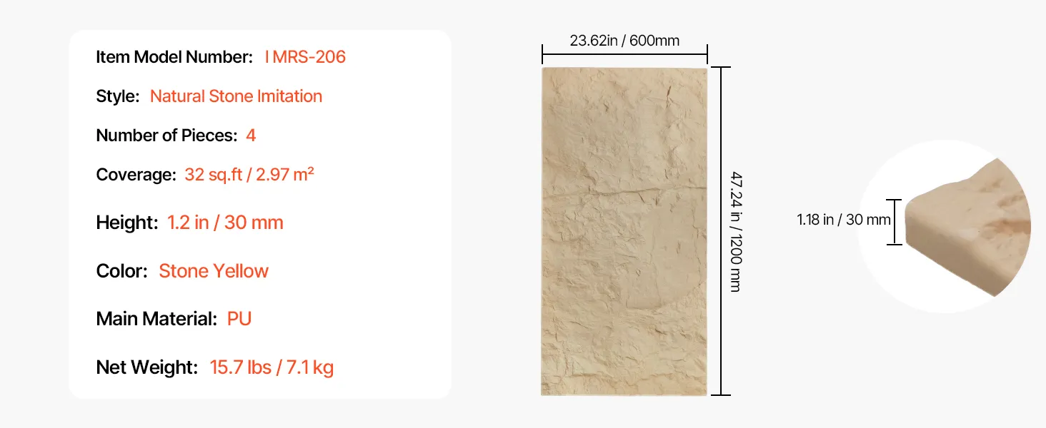 | Rozmery výrobku (D x Š x V) | 48 x 24 x 1,2 palca / 1200 x 600 x 30 mm |