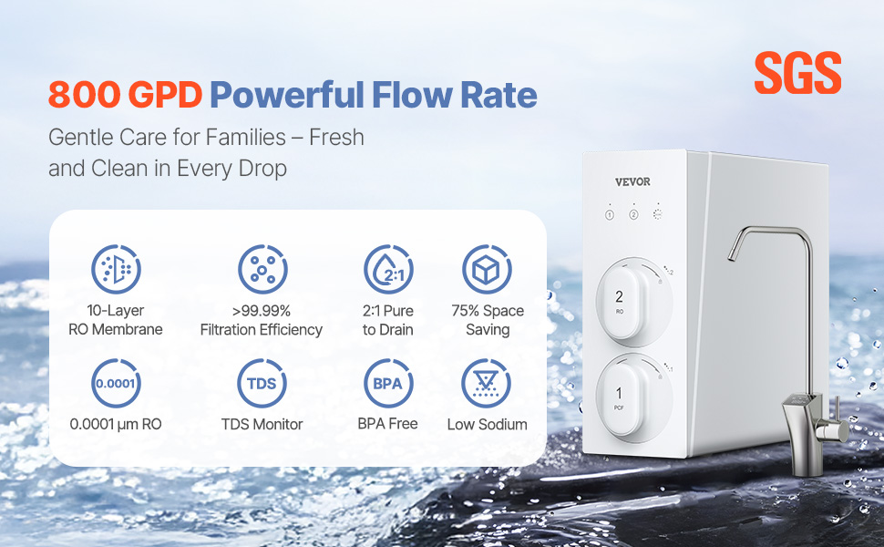 Vďaka pomeru čistej a odpadovej vody 2:1 tento beztlakový systém RO maximalizuje účinnosť vašej vody. Okrem toho jeho veľkorysá kapacita 800 GPD a prietok 2,1 l/min podporujú všetky vaše potreby, ako je umývanie ovocia, varenie a používanie spotrebičov.