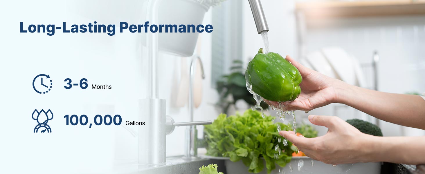 Filtruje až 100 000 galónov vody, so životnosťou 4 - 6 mesiacov, filtračná kazeta znižuje frekvenciu výmeny a šetrí dlhodobé náklady na údržbu.