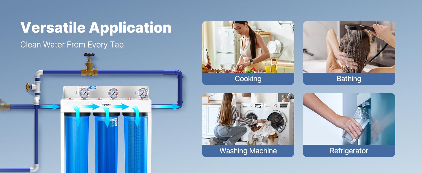 Táto náhradná kazeta na filtrovanie vody v celej domácnosti je vhodná na rôzne spôsoby použitia vody v domácnosti vrátane kuchýň, kúpeľní, chladničiek a práčovní, čím spĺňa všetky vaše potreby na filtrovanie vody.