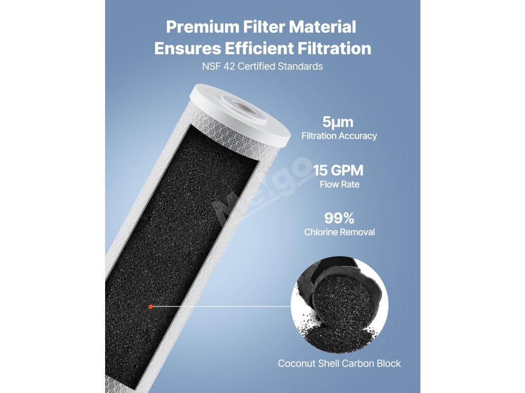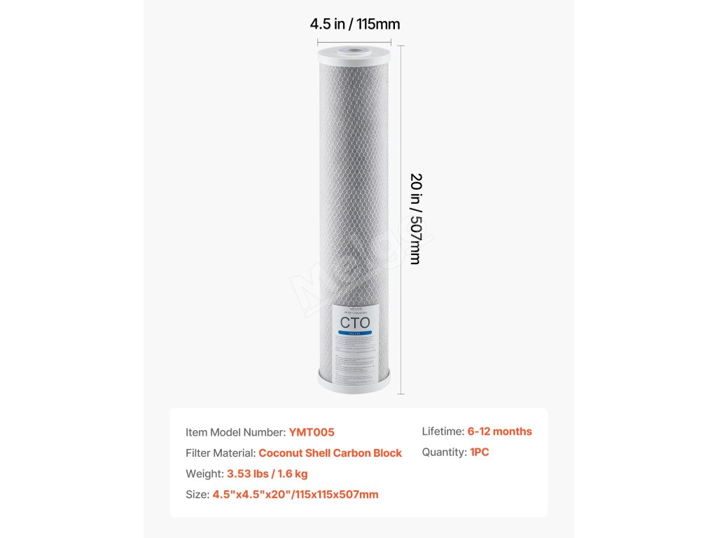 Blokový filter s aktívnym uhlím CTO odstraňuje až 99 % chlóru, pričom zachytáva malé častice a absorbuje rozpustené nečistoty, eliminuje zápach a zlepšuje chuť.