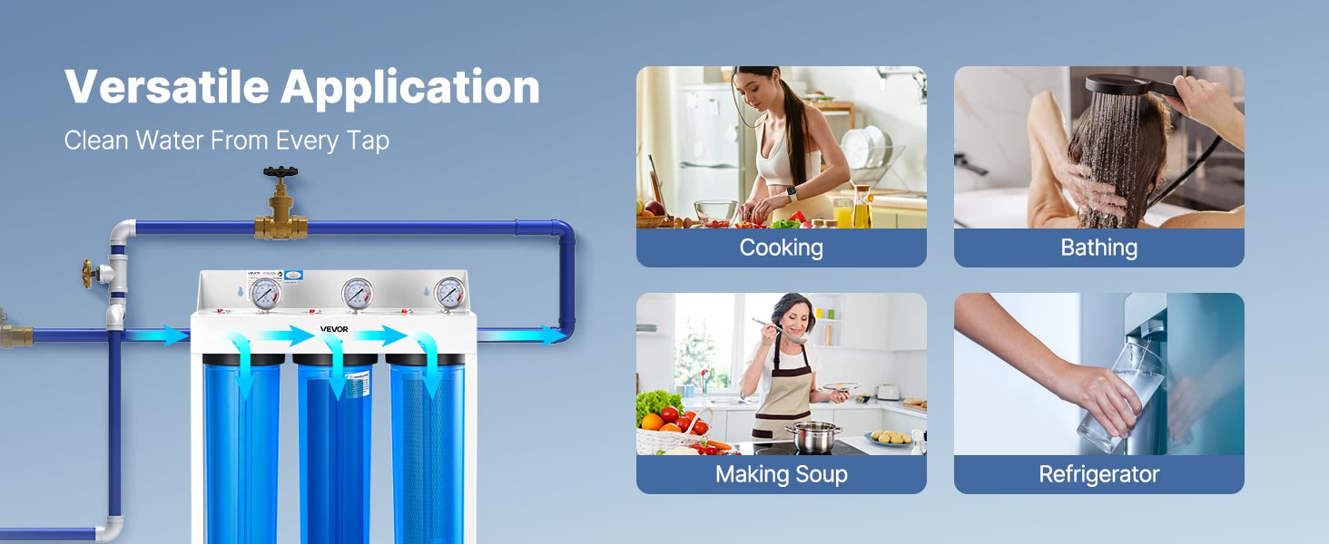 Táto náhradná kazeta na filtrovanie vody v celej domácnosti je vhodná na rôzne spôsoby použitia vody v domácnosti vrátane kuchýň, kúpeľní, chladničiek a práčovní, čím spĺňa všetky vaše potreby na filtrovanie vody.