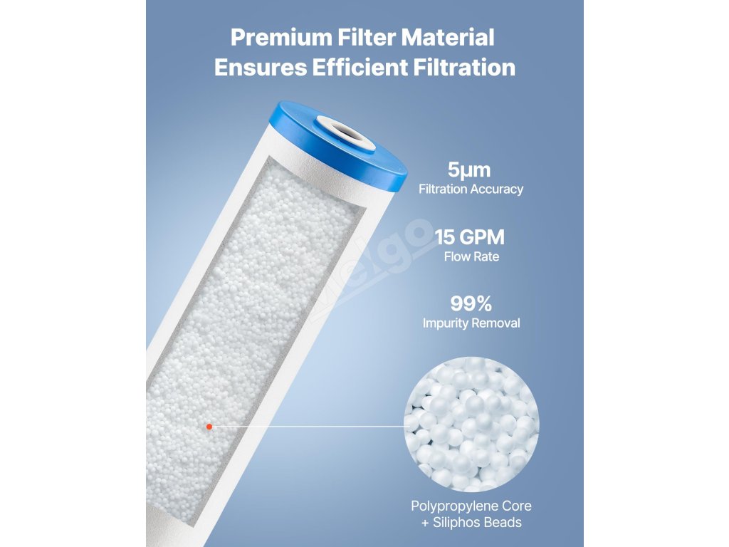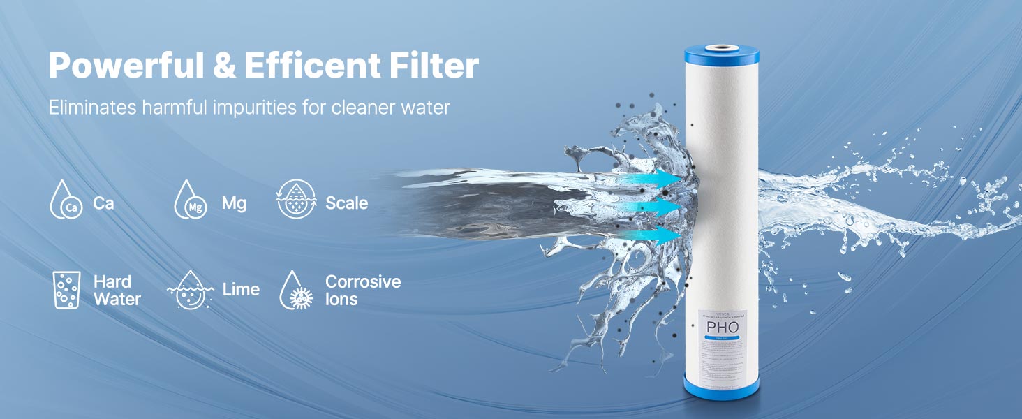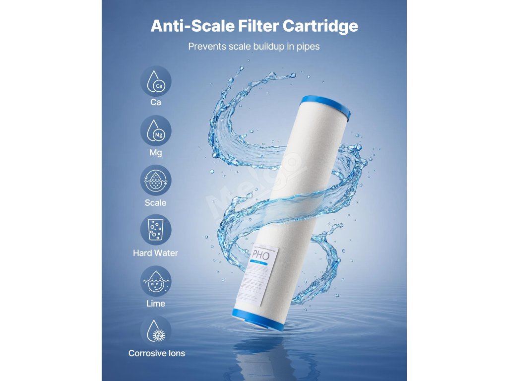 Filter s inhibítorom vodného kameňa odstraňuje ióny vápnika a horčíka, čím znižuje tvorbu vodného kameňa, zmäkčuje vodu a chráni vaše spotrebiče a vodovodný systém pred usadzovaním vodného kameňa a koróziou.