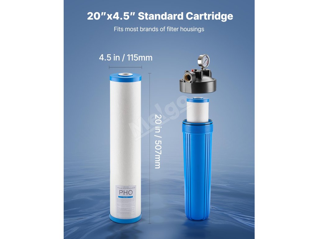 Náhradná kazeta má štandardnú veľkosť 4,5" x 20" s vysokou prietokovou kapacitou, je kompatibilná s väčšinou filtračných puzdier a systémov filtrácie vody v celom dome, vďaka čomu je výmena jednoduchá a bezproblémová.