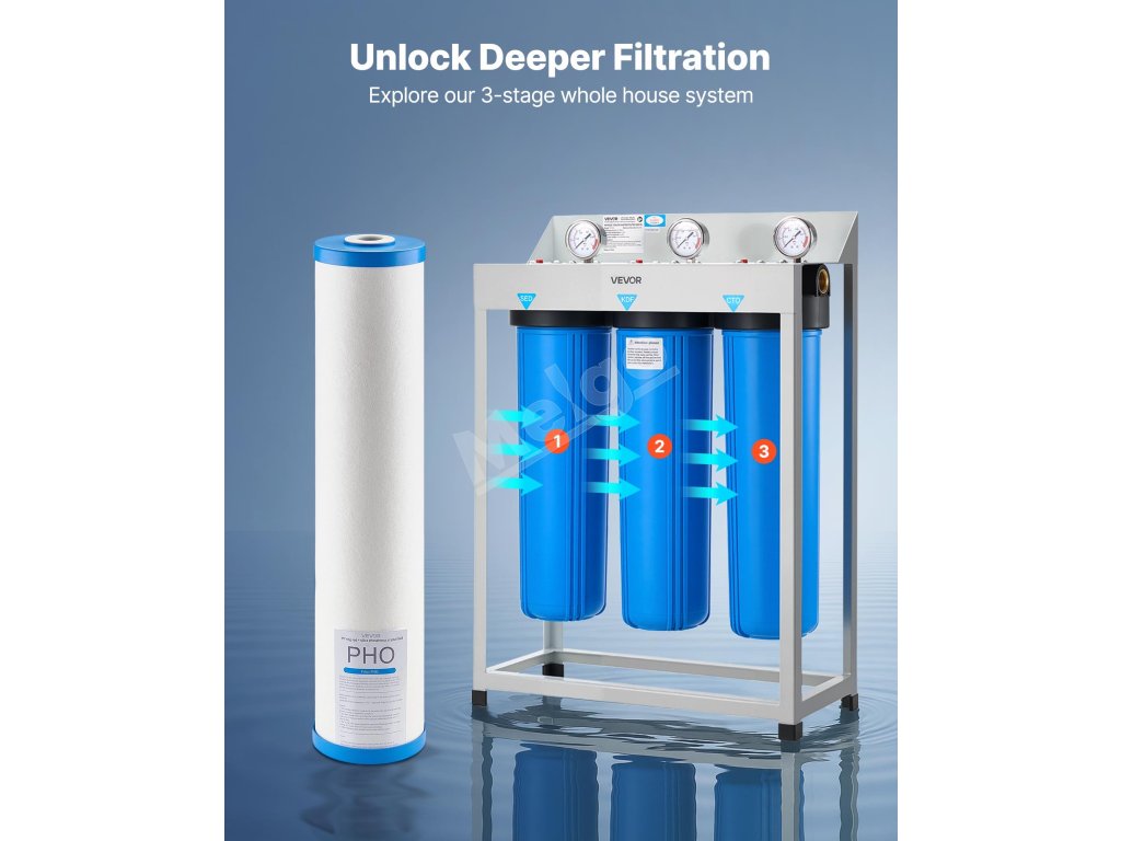 Náš 3-stupňový systém filtrácie vody pre celú domácnosť využíva viacero filtračných procesov na hĺbkové čistenie vody z vodovodu a studne, pričom odstraňuje nečistoty a kontaminanty, aby zabezpečil čistú vodu v celej vašej domácnosti.