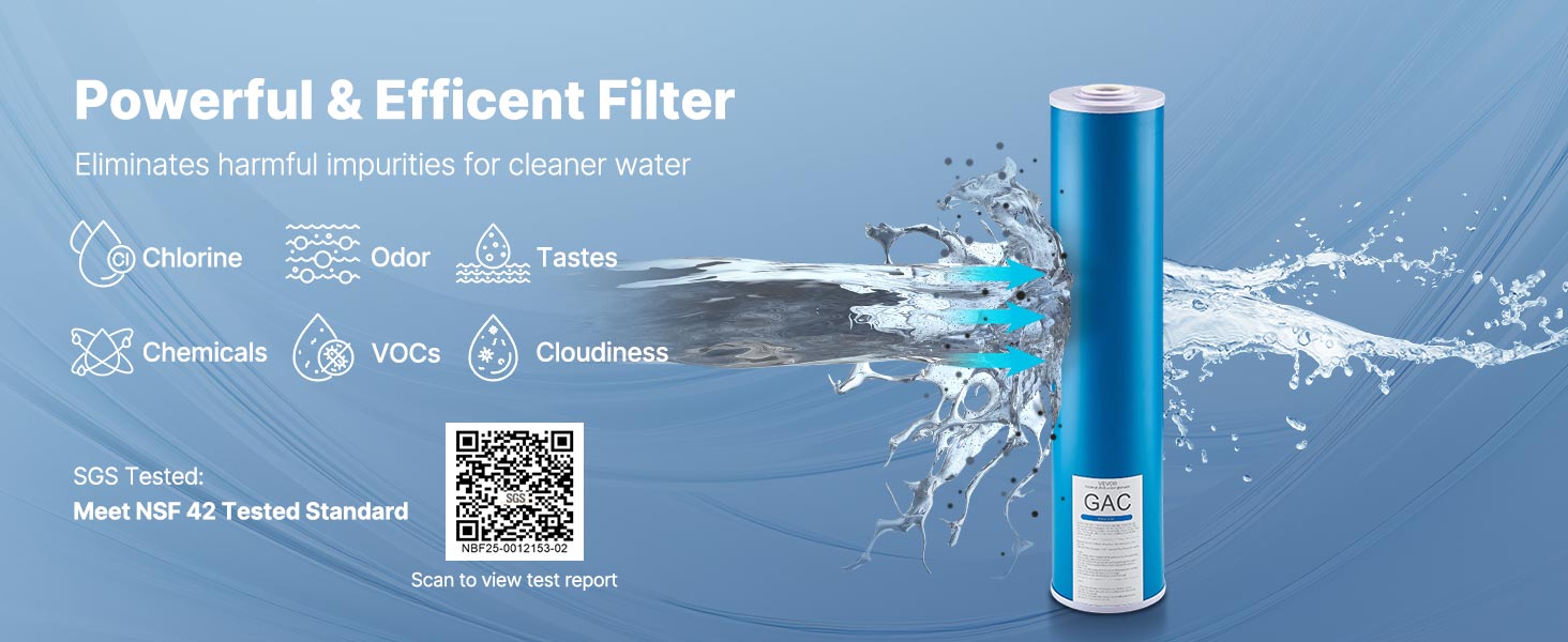 Filter s aktívnym uhlím GAC odstraňuje až 99 % chlóru, pričom zachytáva malé častice a absorbuje rozpustené nečistoty, eliminuje zápach a zlepšuje chuť.
