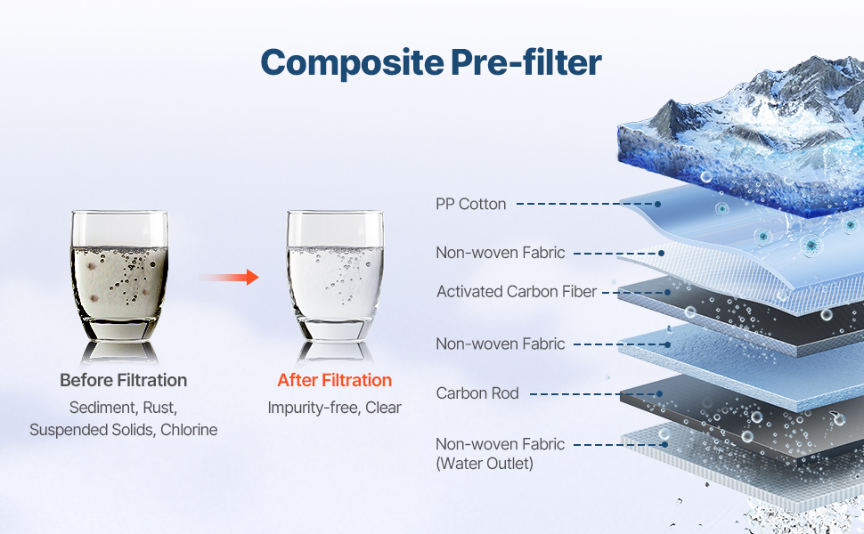 Predfilter multi-in-1 nášho filtračného zariadenia na reverznú osmózu pod umývadlo účinne redukuje usadeniny, hrdzu, častice, suspendované látky a iné nečistoty, čím vám zaručuje, že si budete môcť vychutnávať čistejšiu a čistejšiu vodu.