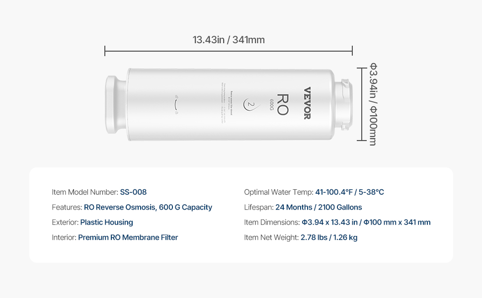 Vďaka pokročilej filtračnej technológii a otočnému vstupu vody zvyšuje náš filter pre systémy reverznej osmózy prietok a znižuje riziko upchatia. Produkuje 600 galónov za deň, čím zabezpečuje vysokokvalitnú vodu pre vašu rodinu. Rozlúčte sa s častými výmenami, pretože filter vydrží až 24 mesiacov.