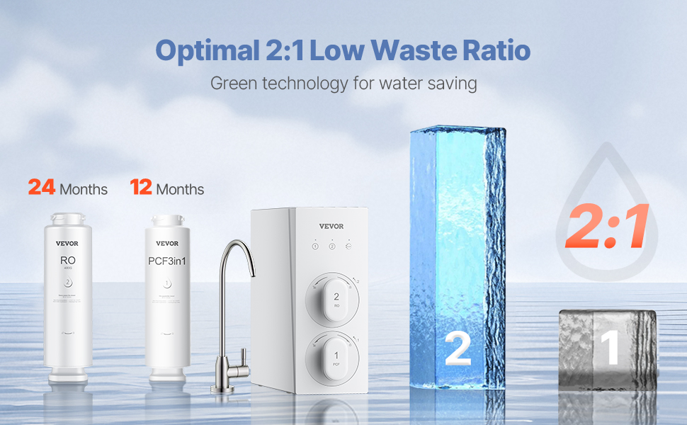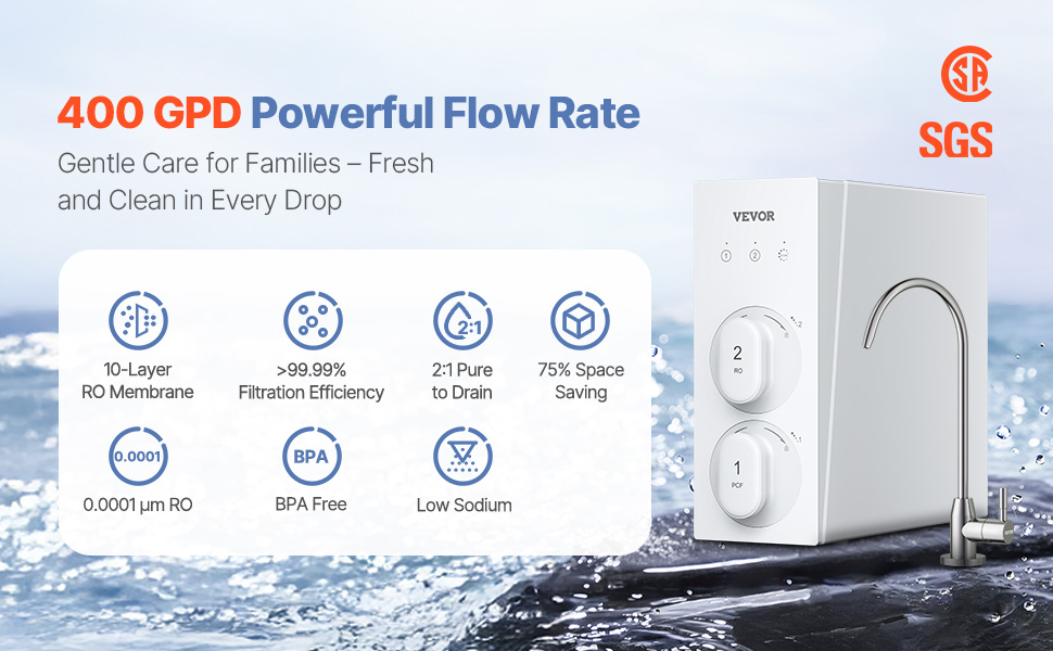 Vďaka pomeru čistej a odpadovej vody 2:1 tento beztlakový systém RO maximalizuje účinnosť vašej vody. Okrem toho jeho veľkorysá kapacita 400 GPD a prietok 1 l/min podporujú všetky vaše potreby, ako je umývanie ovocia, varenie a používanie spotrebičov.